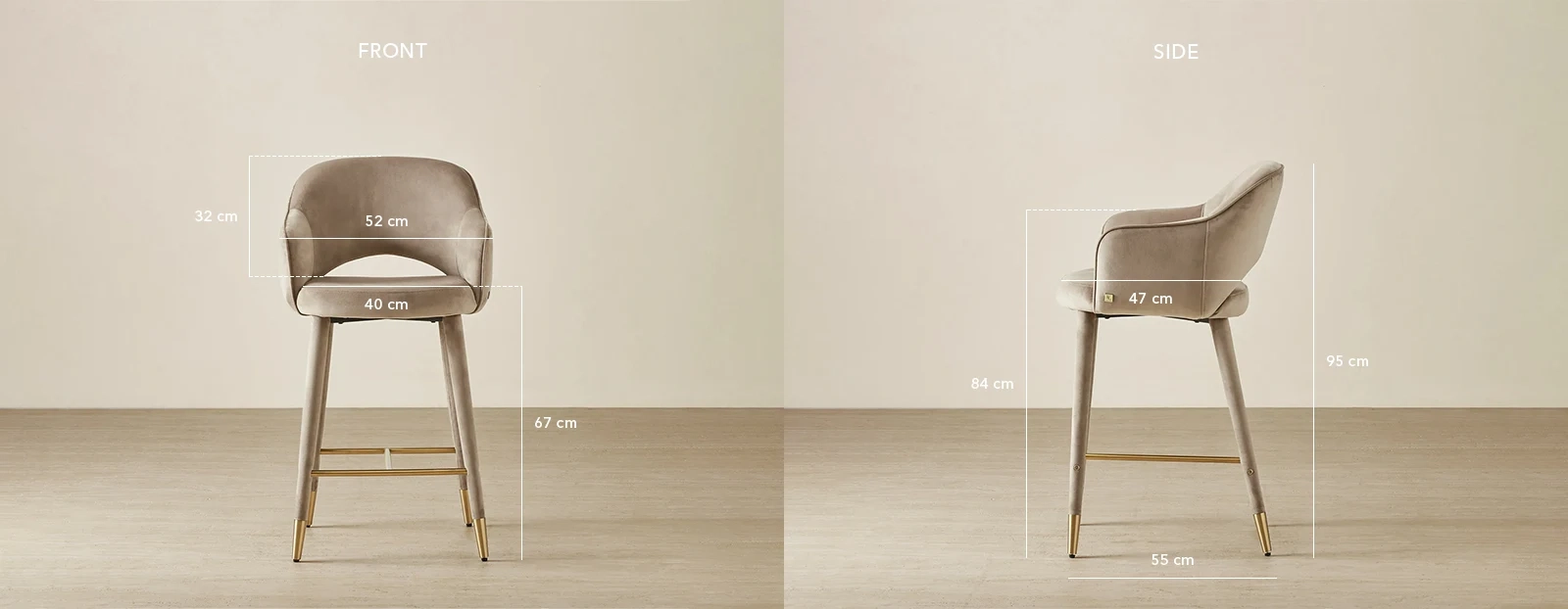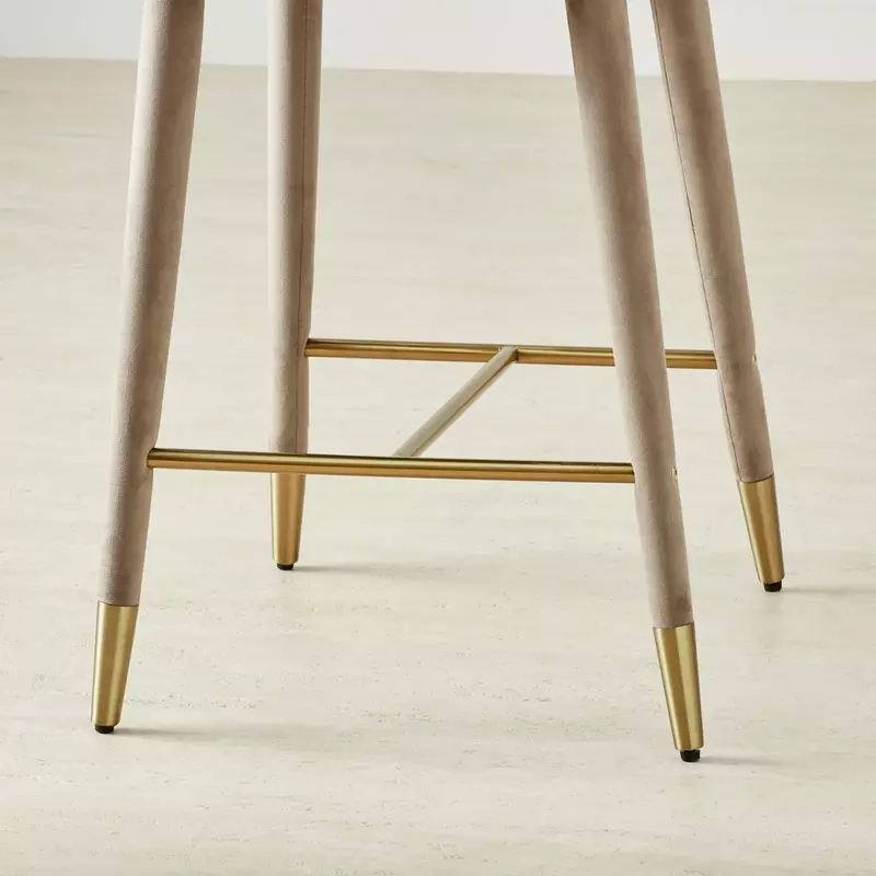 Gold-capped legs and a sturdy footrest add a touch of elegance and functionality. The velvet fabric finish enhances the stool's timeless appeal.