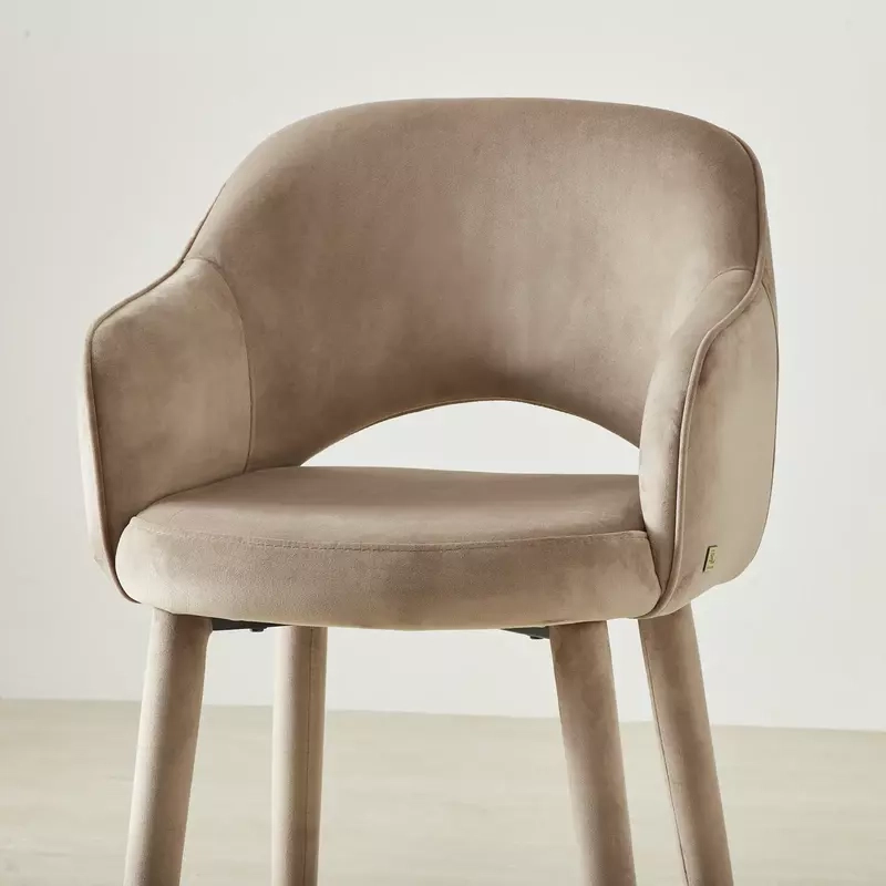 The Adrianna Beige Velvet Counter Stool combines modern design with practical comfort. Its curved backrest and armrests provide a supportive seating.