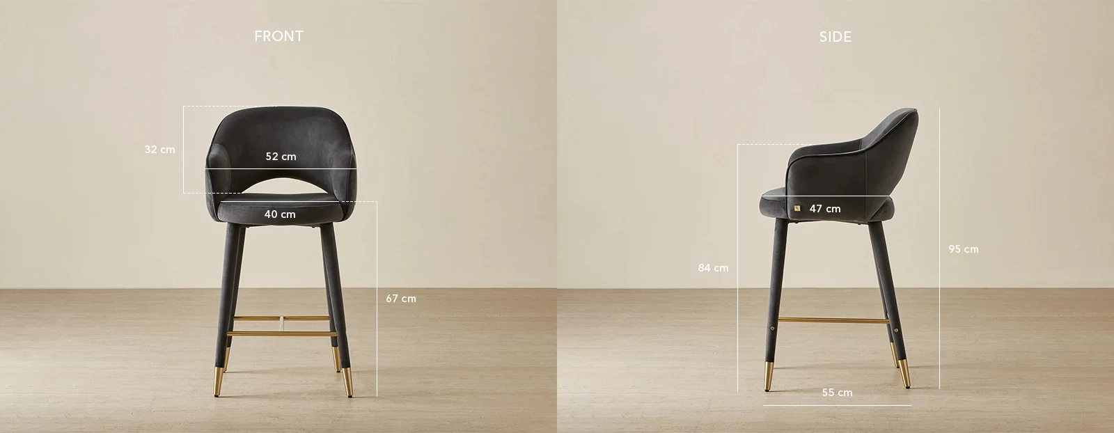 The Adrianna Charcoal Velvet Counter Stool combines modern design with practical comfort. Its curved backrest and armrests provide a supportive seating.