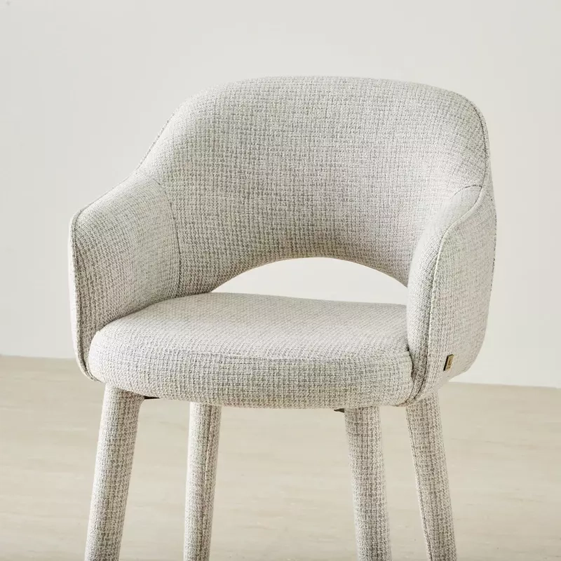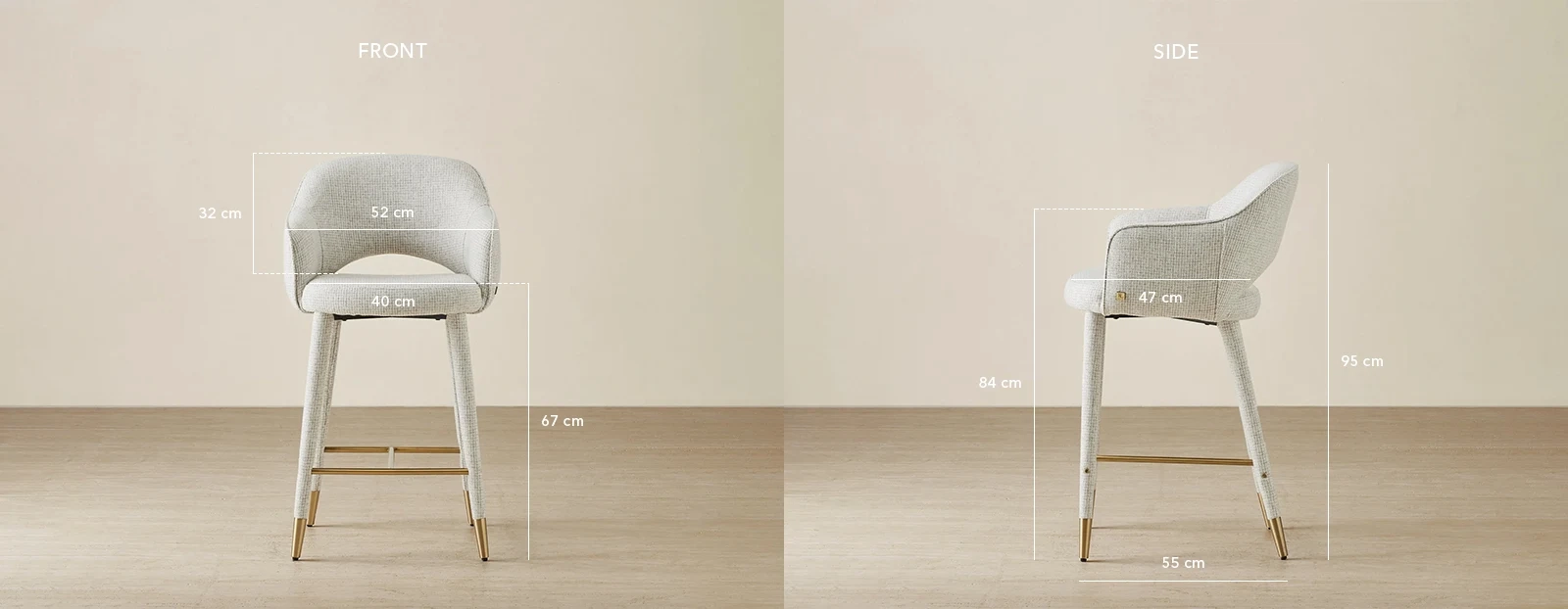 The Adrianna Dove Grey Counter Stool combines modern design with practical comfort. Its curved backrest and armrests provide a supportive seating.