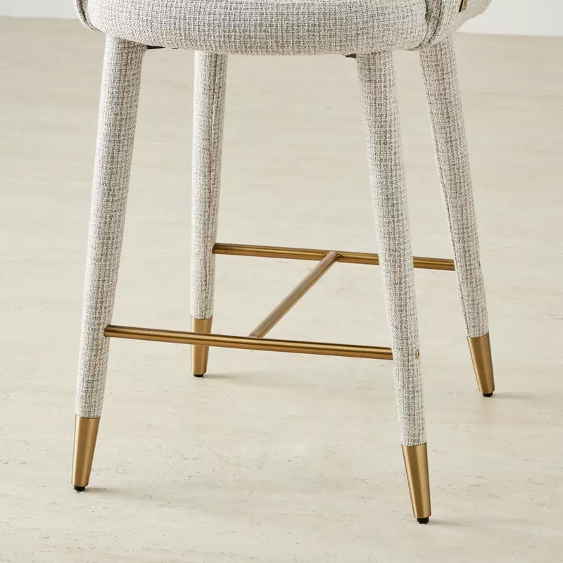 Gold-capped legs and a sturdy footrest add a touch of elegance and functionality. The woven fabric finish enhances the stool's timeless appeal.