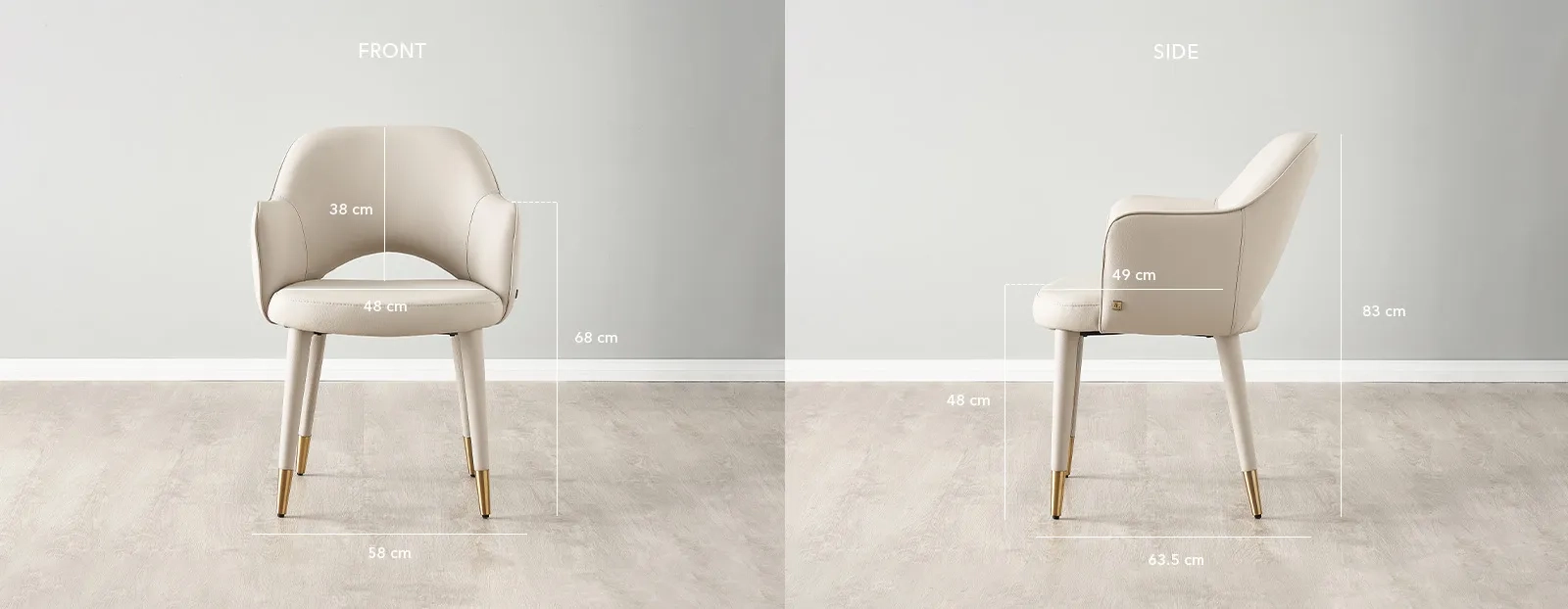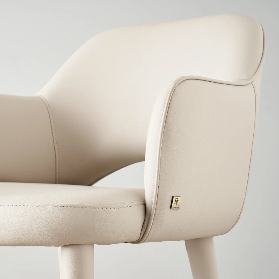 The glacier grey vegan leather is a testament to modern craftsmanship and ethical luxury. This material choice not only provides a tactile experience of indulgent softness but also ensures durability and ease of maintenance, which are essential for daily dining use. The cool, understated tone of the grey brings a sense of calm sophistication to the room, harmonizing with a variety of color palettes. Completing the chair's elegant stance are its legs, which bear golden-tipped highlights as a nod to opulence yet done with subtlety. This gentle contrast between the muted grey and the glint of gold enriches the chair's visual appeal, presenting a balanced interplay of luxury and functionality.
