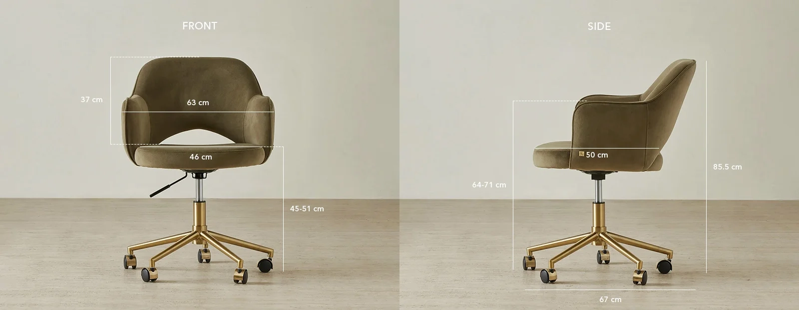 The Adrianna Office Chair is designed to support you through long hours with comfort and ease. Upholstered in Olive Green velvet, it offers a soft, plush surface with a rich tone suited to everyday use.