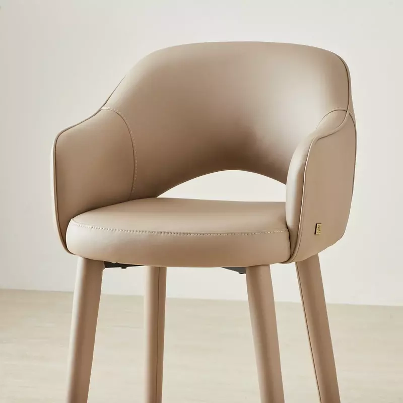 The Adrianna Sand Beige Vegan Leather Counter Stool combines modern design with practical comfort. Its curved backrest and armrests provide a supportive seating.