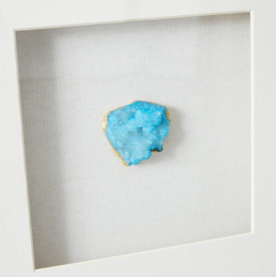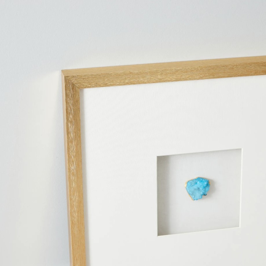 The Aegean Blue Crystal Shadow Box is a treasure trove of serene beauty, with a stunning blue crystal stone cradled at its center. This gem-like focal point, reminiscent of the tranquil Aegean Sea, radiates from within the purity of an all-white backdrop, symbolizing clarity and calmness.
