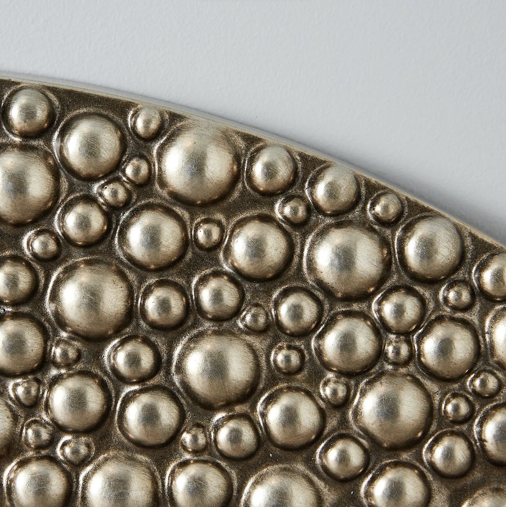 The Alison Silver Finish Round Mirror is more than just a reflective surface; it's a testament to artistry and intricate design. Its silver frame, adorned with chrome pebbled detailing, offers a refreshing divergence from the conventional, embracing a natural and free-flowing aesthetic. This unique craftsmanship is further highlighted by a motif of varying coloured spheres, reminiscent of effervescent bubbles or opulent pearls.