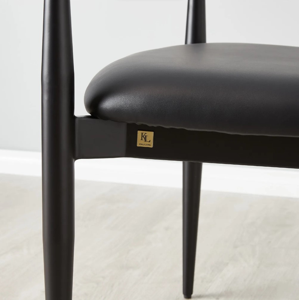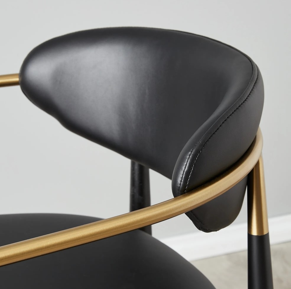 Lounge comfortably on the Amy's plush seat and backrest, both of which are upholstered with luxe black vegan leather. The frame features four elegantly tapered legs and a convenient footrest.