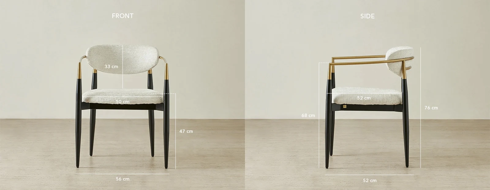 Upholstered in Fusion Grey woven fabric, the plush seat and backrest invite you to sit in comfort. Golden-coloured embellishments add a refined touch, completing its polished dining appeal.