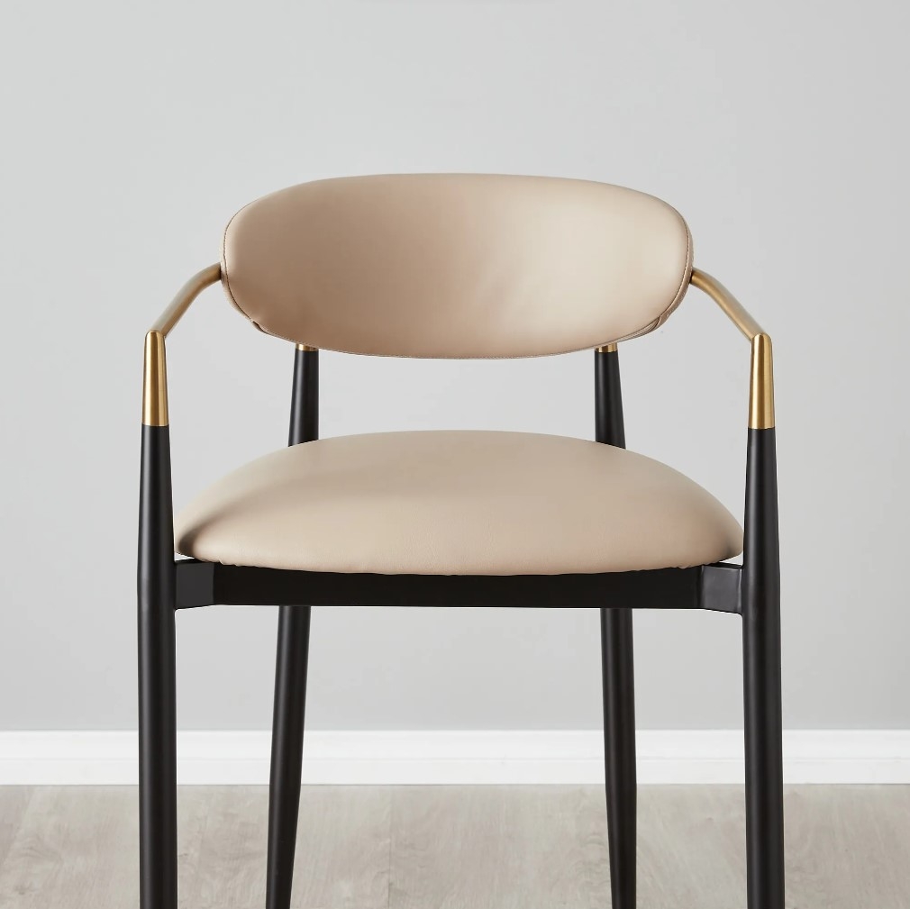 Lounge comfortably on the Amy's plush seat and backrest, both of which are upholstered with luxe sand beige vegan leather. The frame features four elegantly tapered legs and a convenient footrest.