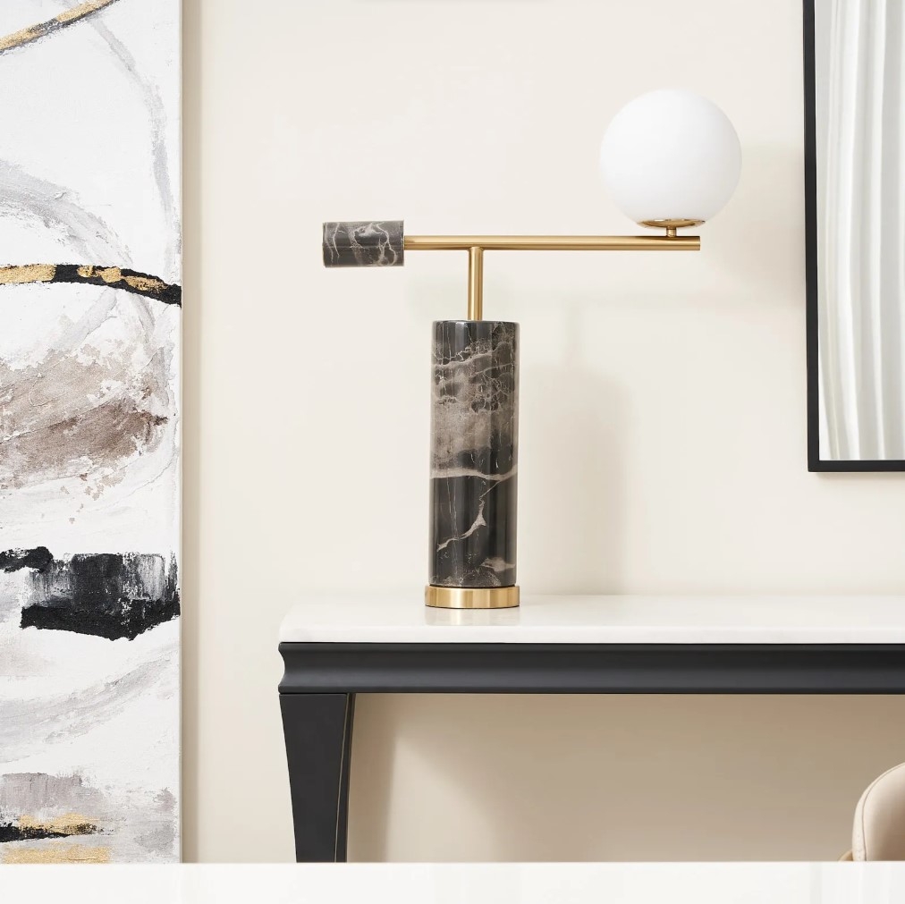 One end is adorned with a glass sphere, a delicate cocoon that cradles the light. The other end is balanced with another cylindrical marble piece. In this delicate interplay of elements, the Anastasia Table Lamp emerges - a beacon of luxe style and refined elegance for your home.