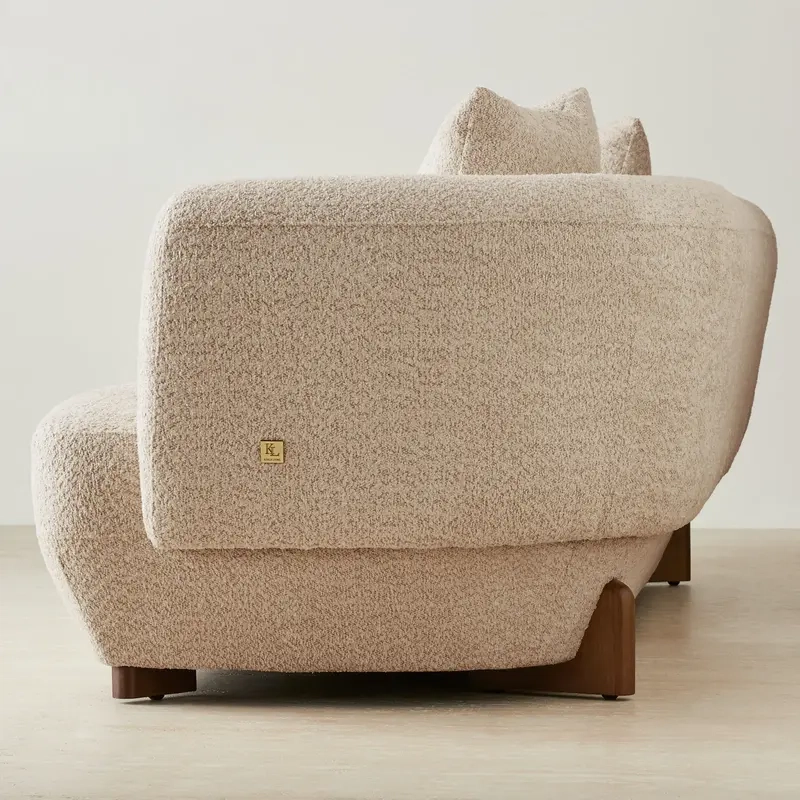 The Antonella Fabric Sofa is upholstered in mid beige woven fabric, offering a soft and textured surface. With its spacious design, it’s a versatile choice for modern living spaces.