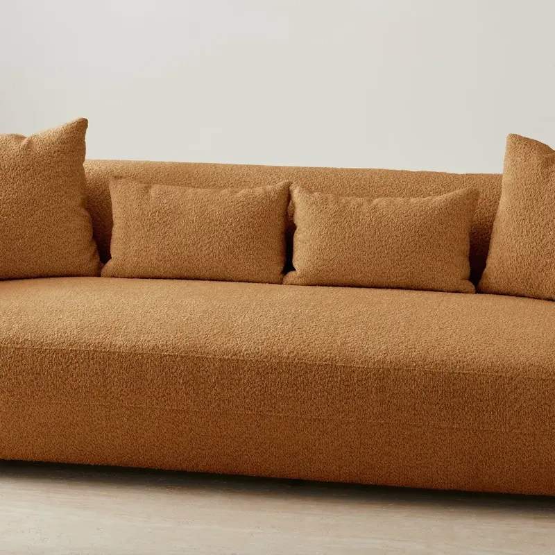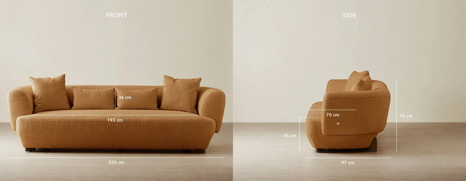 The Antonella 3-Seater Sofa is upholstered in vintage mustard woven fabric, offering a soft and textured surface. With its spacious design, it’s a versatile choice for modern living spaces.