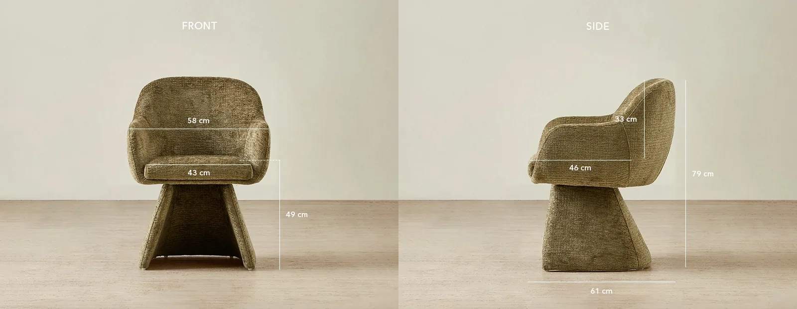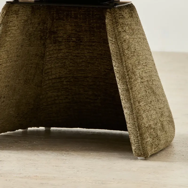 The Antonia Dining Chair in Army Green brings modern comfort and form to the dining space. Its smooth, rounded silhouette flows into gently curved arms.