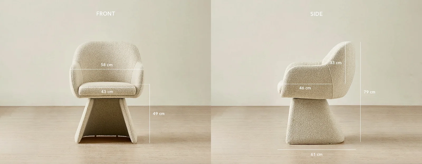 The Antonia Dining Chair in Pearl Beige Fabric brings modern comfort and form to the dining space. Its smooth, rounded silhouette flows into gently curved arms.