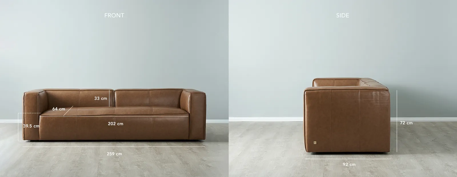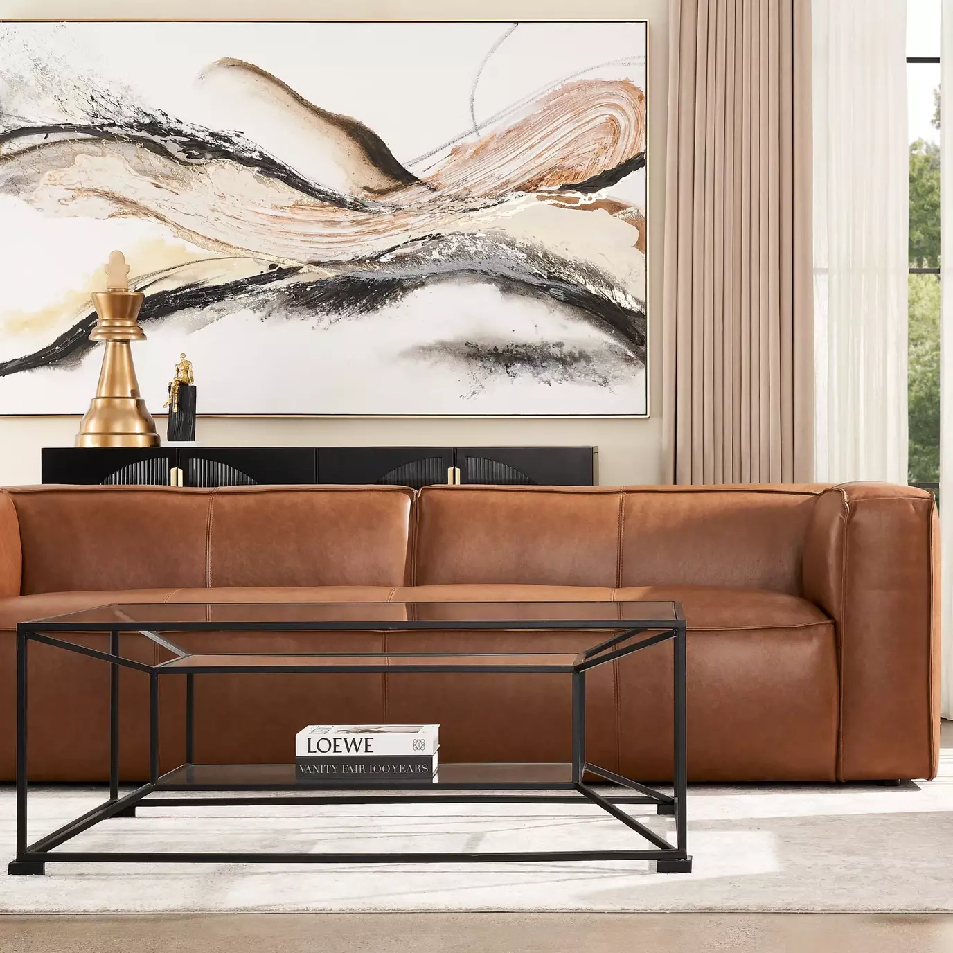 Its vintage tan leather upholstery and plush design bring warmth and comfort, creating an inviting space perfect for family lounging. Ideal for movie nights, it seats up to four people and pairs well with a coffee table and stylish rug.