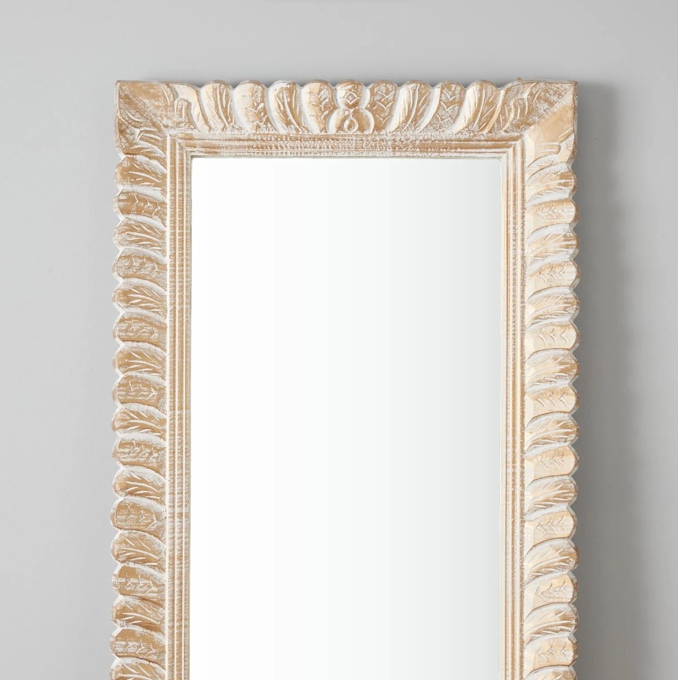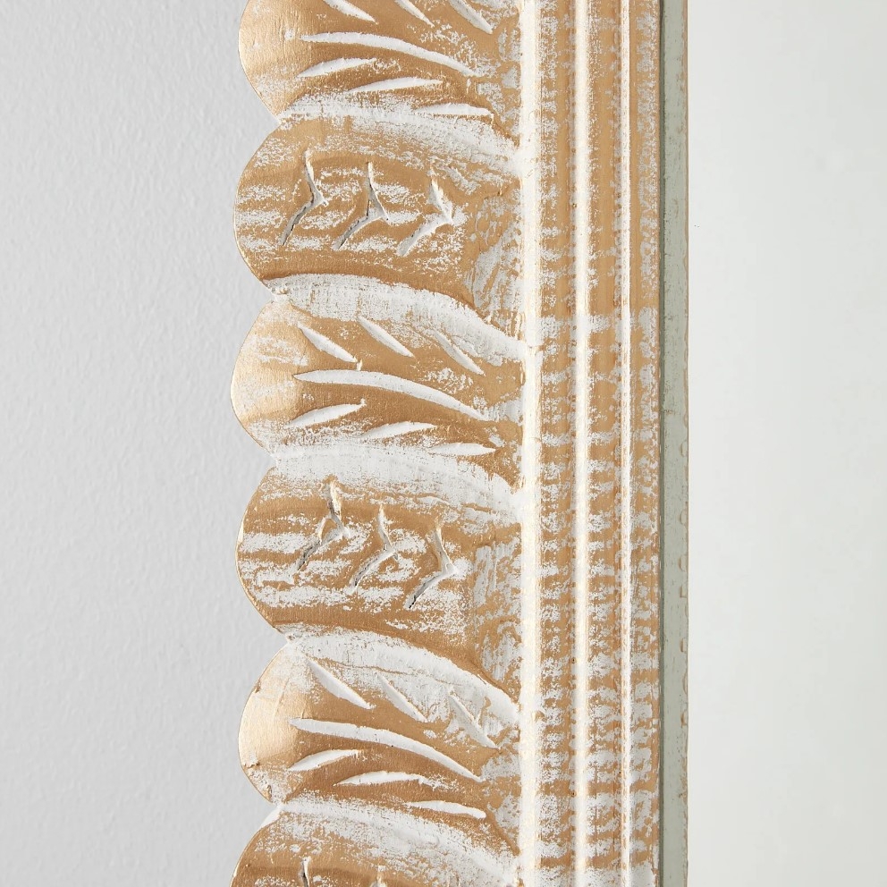 Crafted from the finest mango wood, the mirror's surround is an ode to nature with its leaf-like patterns, each leaf meticulously shaped and painted in weathered white and golden hues. The result is a marriage of form and function, where the mirror not only amplifies the space but adds a layer of artistic beauty, turning any room into a canvas of elegant design and timeless appeal.