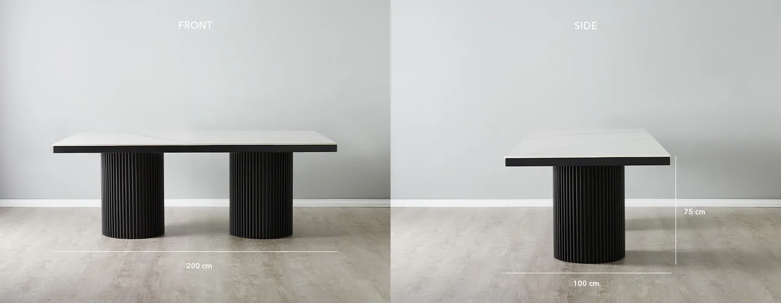 The two supporting columns of the Archie are equally striking. Each column is embellished with vertical reeding, adding texture and depth to the design. This detail not only enhances the table's aesthetic appeal but also demonstrates a commitment to craftsmanship and attention to detail. These columns provide a sturdy foundation, ensuring that the table is as functional as it is beautiful. The monochromatic color scheme of the Archie White Sintered Stone Dining Table adds to its luxurious appeal. To complete the look, pair the Archie Dining Table with a selection of stylish dining chairs.