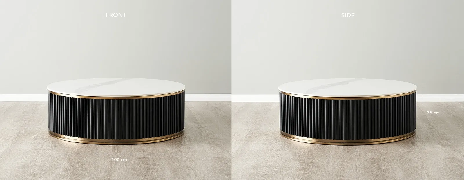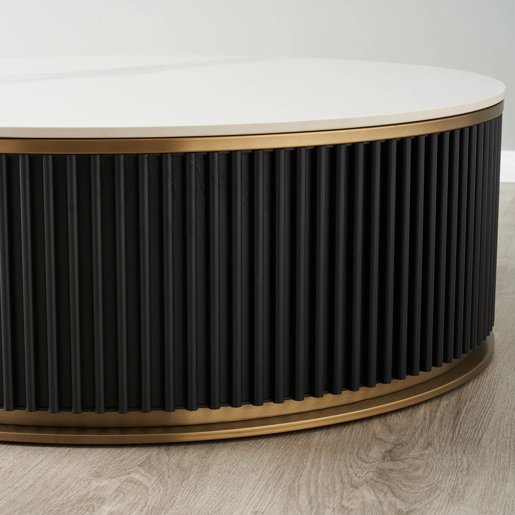 The Archie White Sintered Stone Round Coffee Table combines art-deco design with modern elegance, featuring a sleek white sintered stone top reminiscent of fine marble. Its black vertical reeded stainless steel base adds a striking linear aesthetic, blending luxury with functionality.