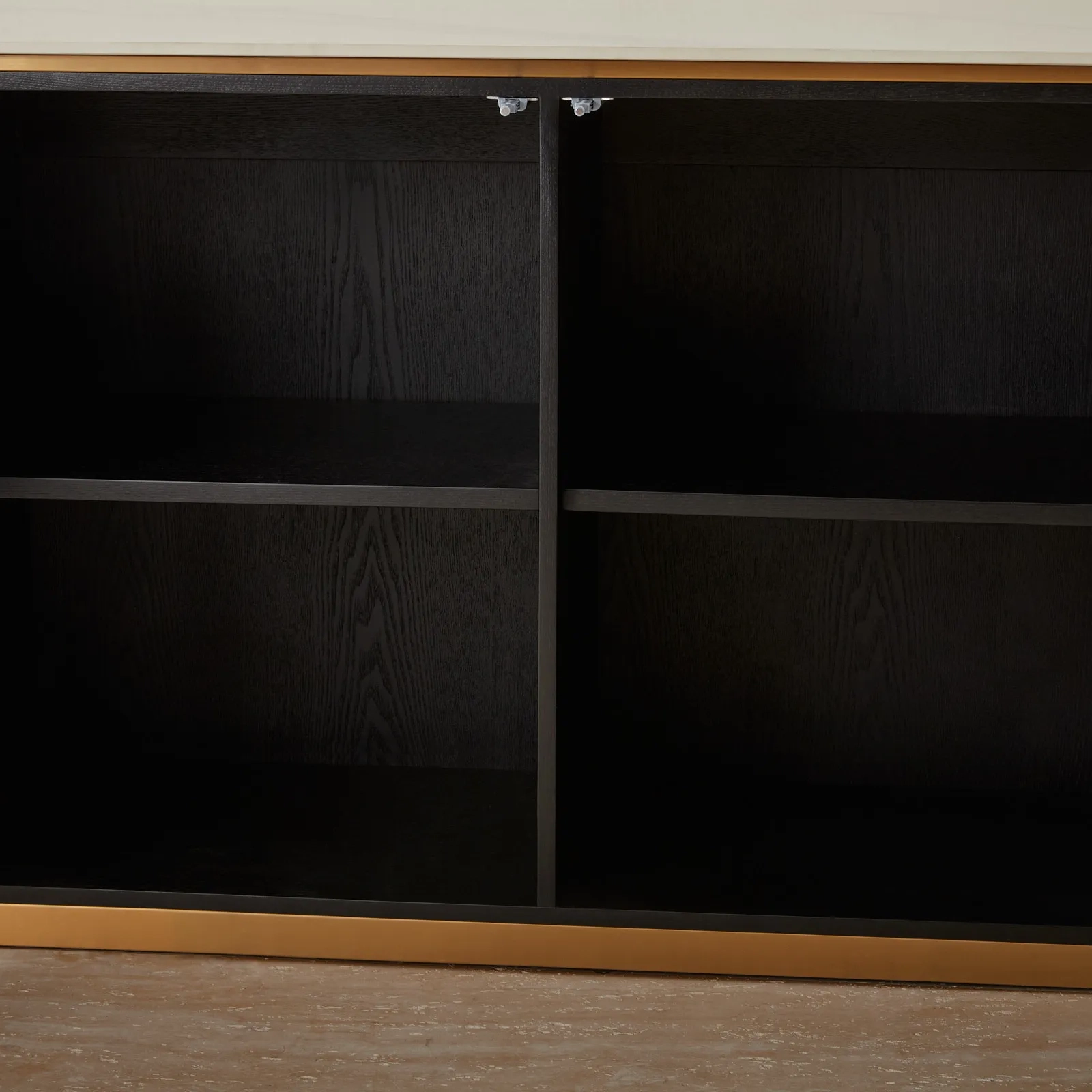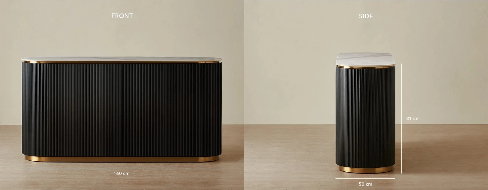 The Archie Sideboard marries durability with high design, featuring a resilient white sintered stone top. This pristine surface is supported by sleek black stainless-steel panels, grounded with a luxe golden base.
