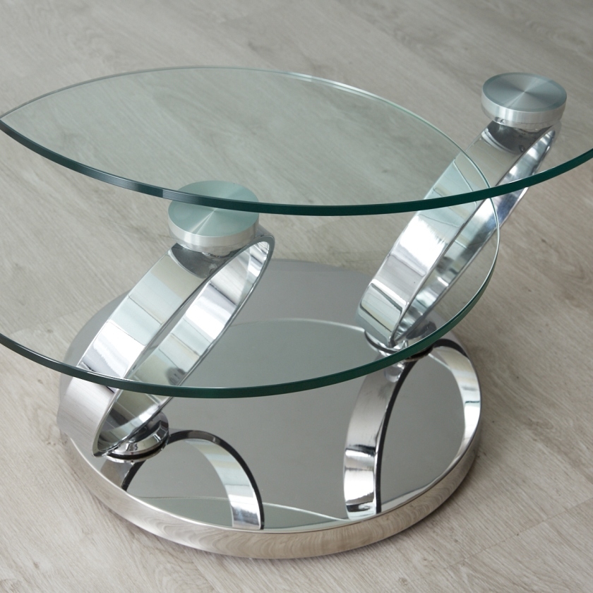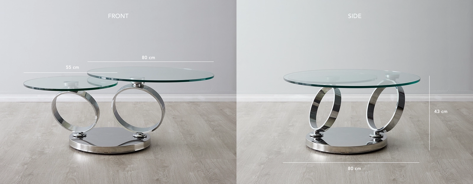 The Arena Coffee Table shines with its contemporary chrome and stainless-steel design with rounded curves and a 360-degree swivel. Two gorgeously round tabletops are secured atop two round stainless-steel frames with an aesthetic reminiscent of modern art pieces.