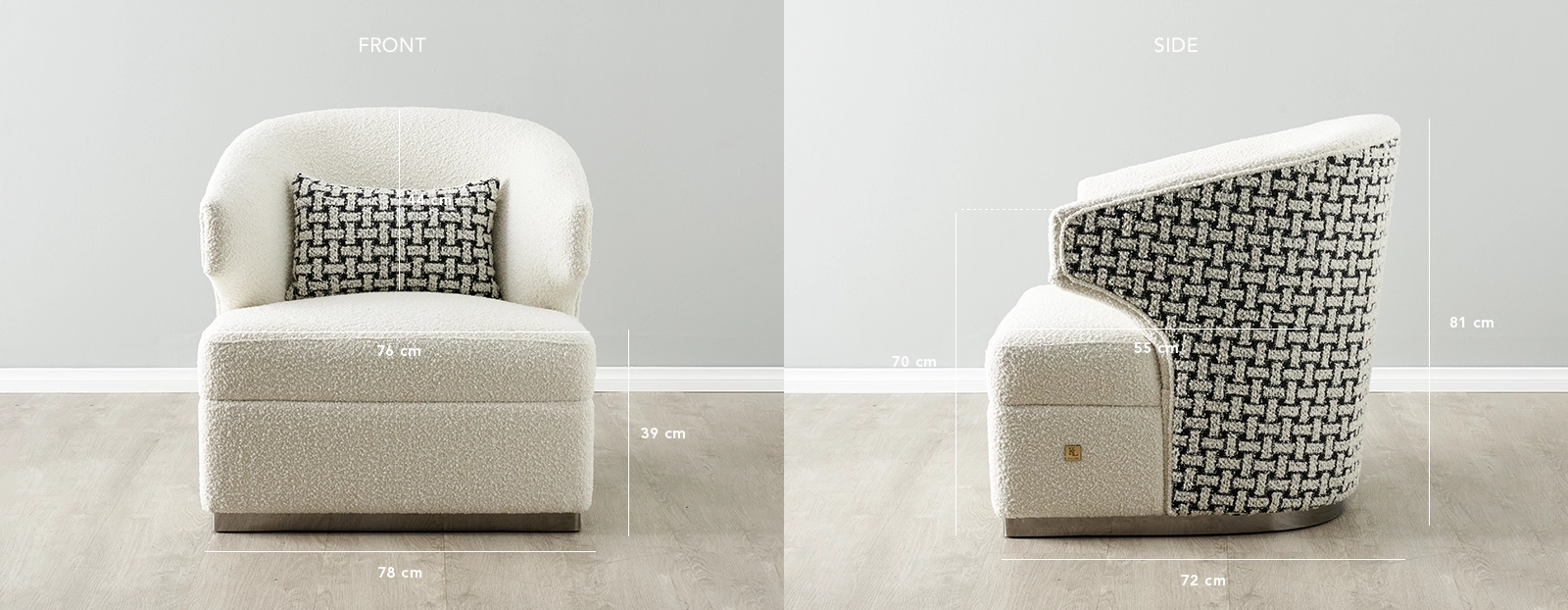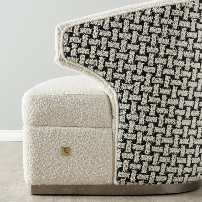 The Arlo's curvilinear frame is lined with fabric and foam for extra comfort. A chain-like motif in charcoal and cream adds an edge to its elegance. The silver steel base enhances its look while providing stability.