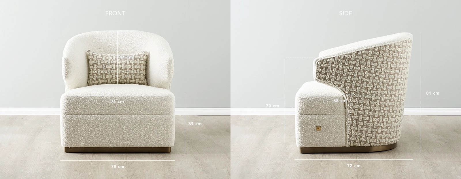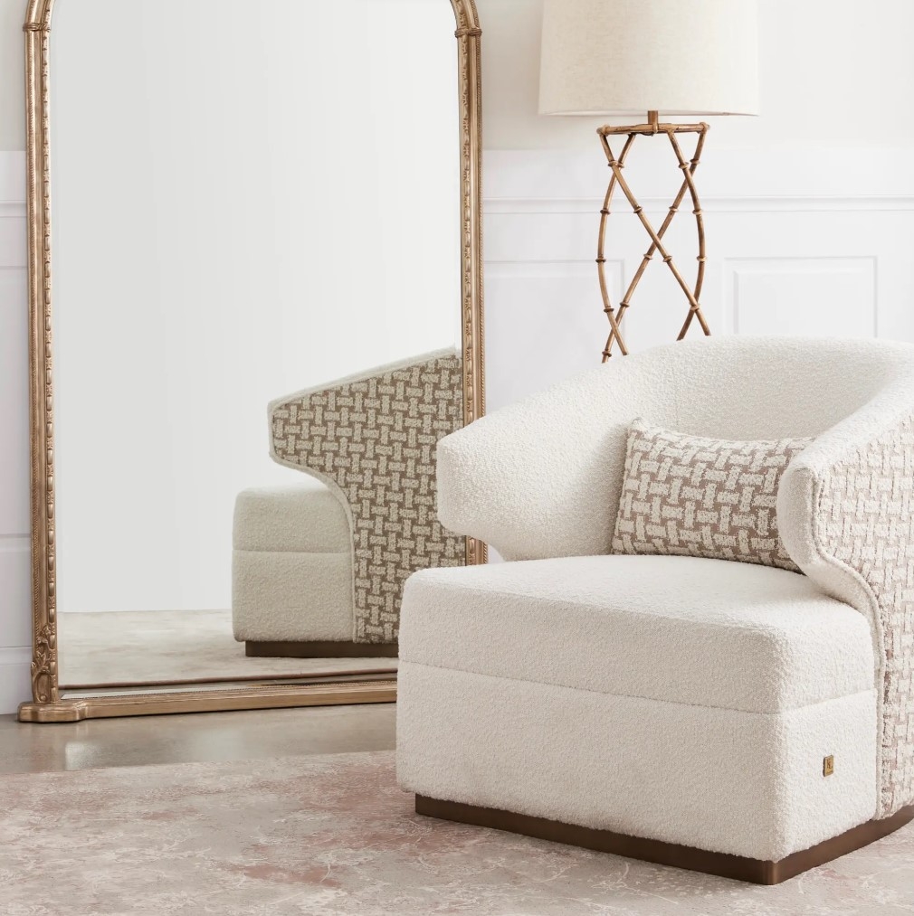 The Arlo's curvilinear frame is lined with fabric and foam for extra comfort. A chain-like motif in Light Grey and Vanilla adds an edge to its elegance. The brass steel base enhances its look while providing stability.