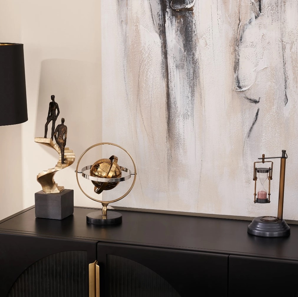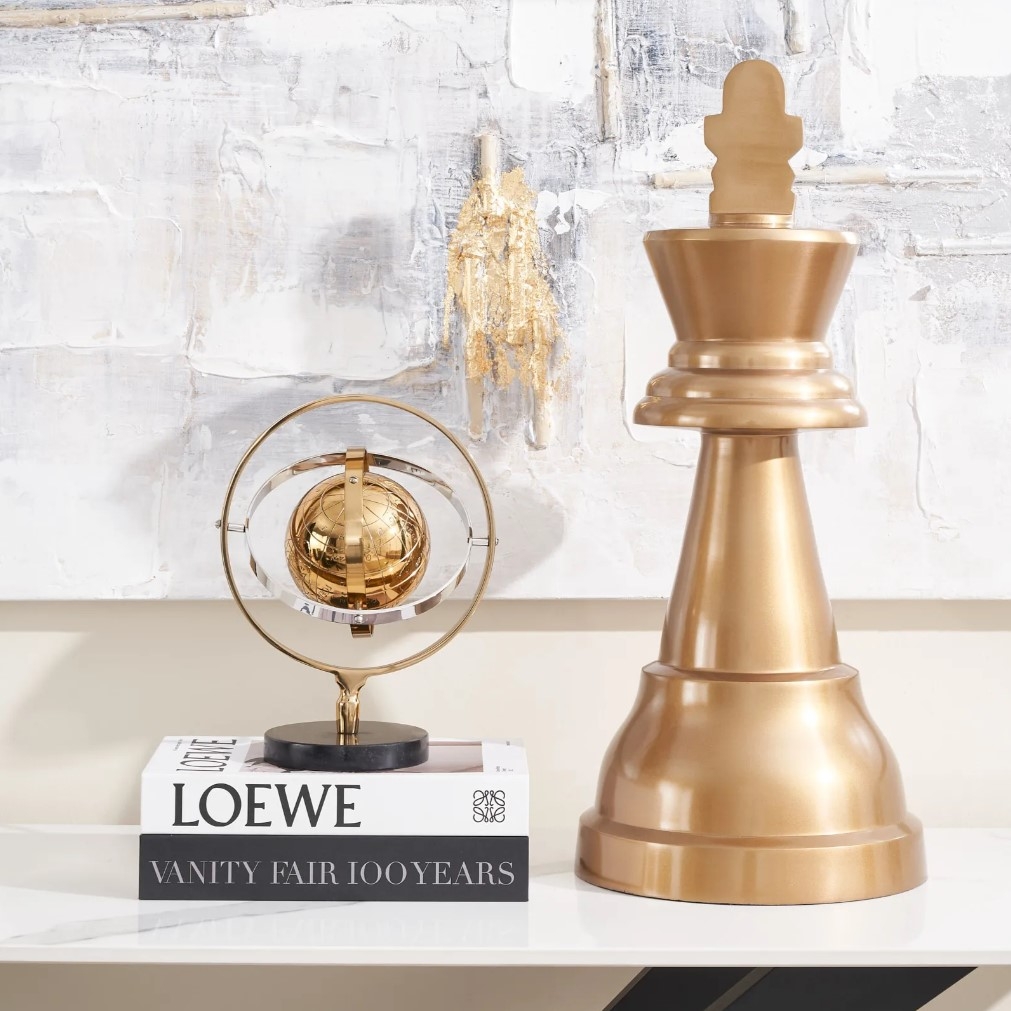 The Armillary Sphere Champagne Gold Metal Decorative piece is a breathtaking fusion of artistry and sophistication, designed to impress and captivate. This exquisite globe, draped in a luxurious champagne gold finish, is not just a decorative item but a statement of elegance and intellectual charm. The surface of the globe is meticulously marked with representations of the continents and seas, each detail crafted to mirror the earth's geography, albeit in an artistic and stylized manner.