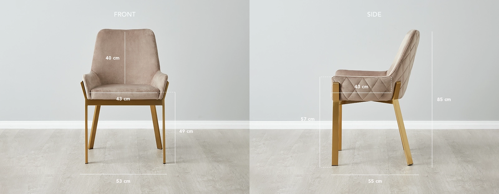 This chair is framed in a chic brushed golden hue, adding a dash of sophistication and warmth to its aesthetic. The combination of beige velvet and the golden frame infuses your dining space with a cozy yet elegant vibe. For a dining ensemble that exudes majesty and comfort, pair the Arya II with one of our grand dining tables, and create a dining experience that is as luxurious as it is welcoming.