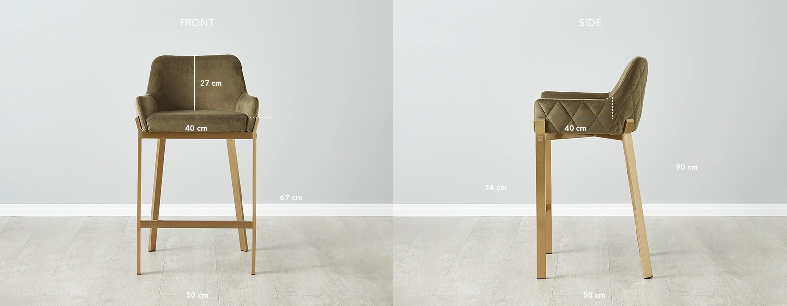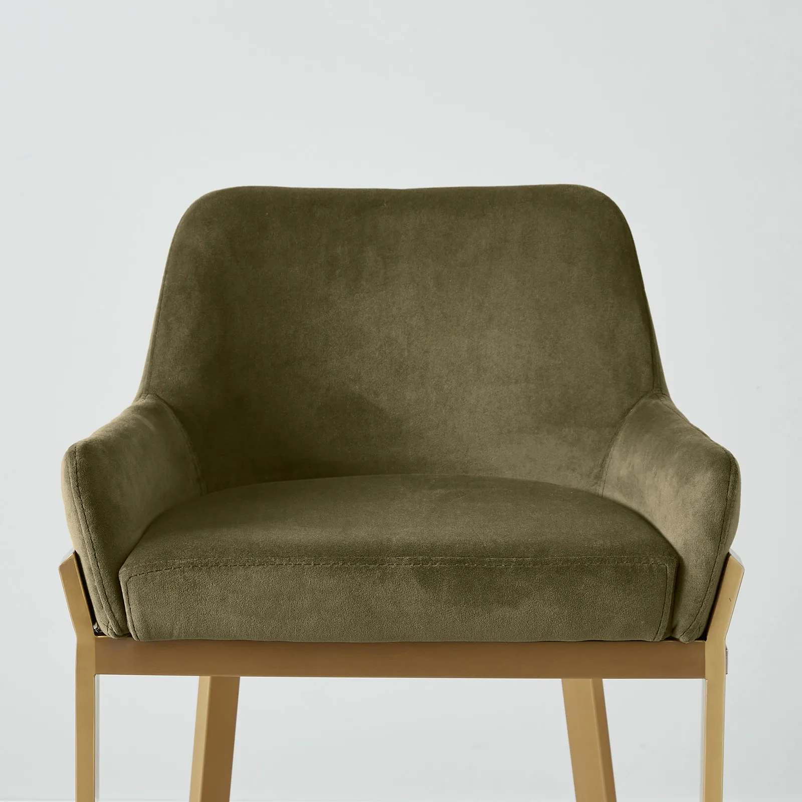 The luxurious velvet, in its rich olive green hue, adds an inviting warmth to your space while serving as an eye-catching focal point. Complementing the lush seat is a stylish steel frame, finished in lustrous gold. This striking contrast between the warm velvet seat and the golden frame infuses depth and character into the overall design, turning the Arya Counter Stool into an unforgettable piece of furniture.