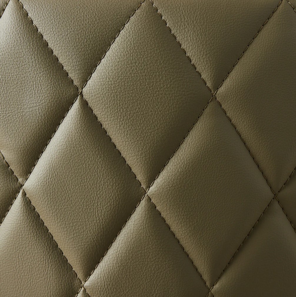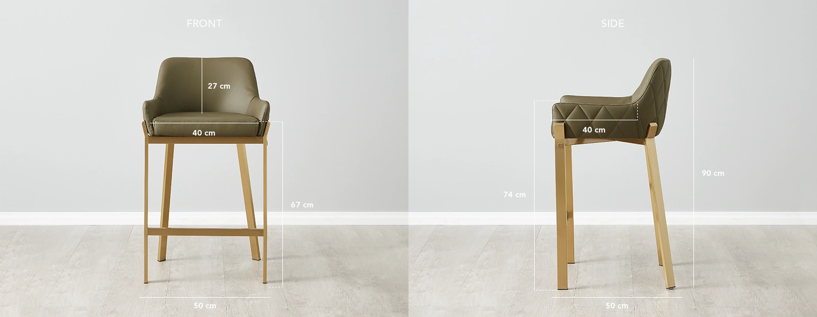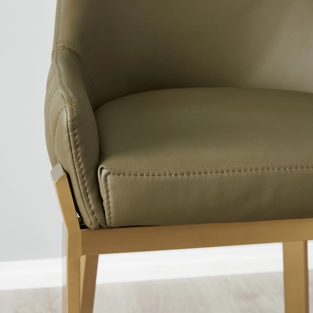The sage green vegan leather, in its refined shade, beckons the eye and becomes a captivating centerpiece in your space. Complementing the rich vegan leather is the stool's sleek steel frame, coated in a lustrous gold finish. This delightful contrast between the light, sophisticated vegan leather and the shimmering gold frame introduces an intriguing dynamic, enriching the stool's overall design with depth and character. The Arya Counter Stool is, undoubtedly, an elegant statement piece that promises to leave an impression.