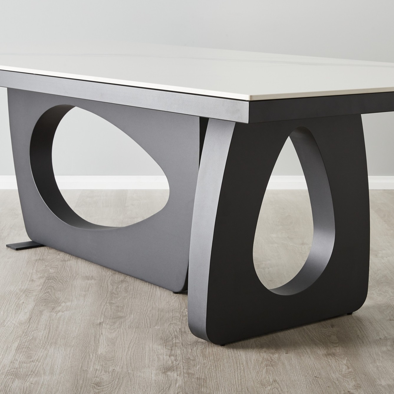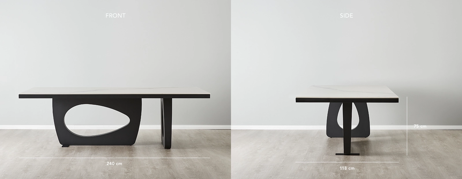 Providing support and visual interest to the Aspen are its masterfully crafted metal frames. At the centre of each frame are artistically designed egg-shaped hollows that further accentuate its modish appeal. Gather your friends and have bountiful celebrations as the Aspen comfortably sits up to 6-8 people. The Aspen Sintered Stone Dining Table is best paired with one of our beautiful monochromatic rugs for a cohesive look of luxury to your dining area.