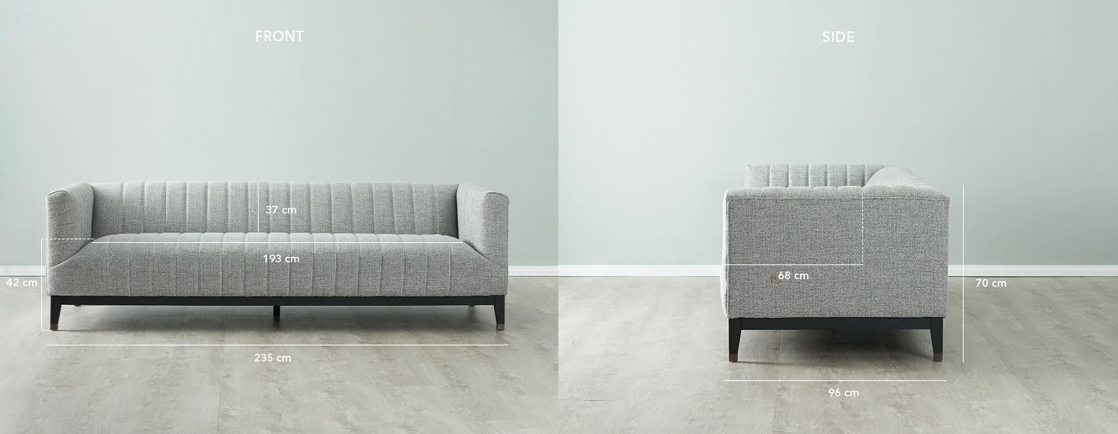 The Astoria III 3-Seater Sofa captures timeless style with its striking tuxedo design. Wrapped in premium grey woven fabric, the sofa exudes luxe elegance.