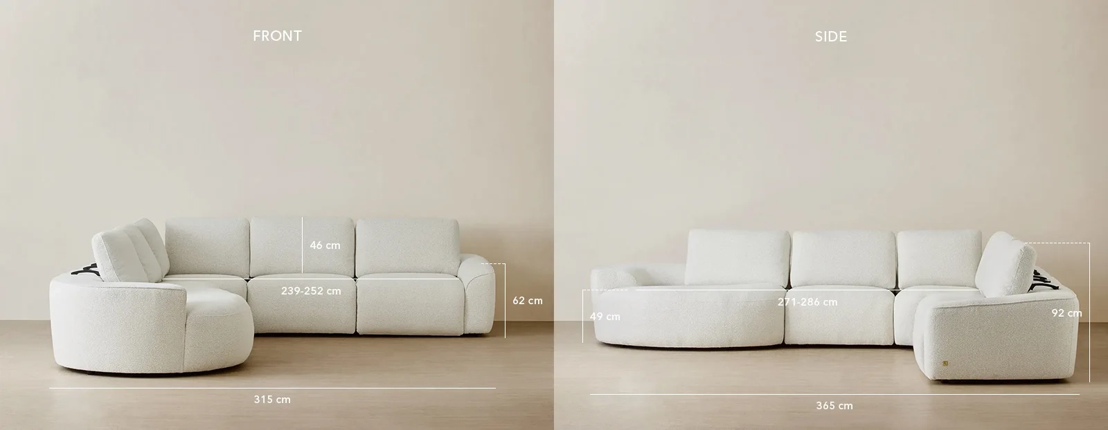 Each modular piece connects, allowing configurations that feel both deliberate and effortless. The right arm seat reveals a reclining feature.
