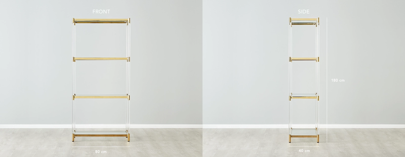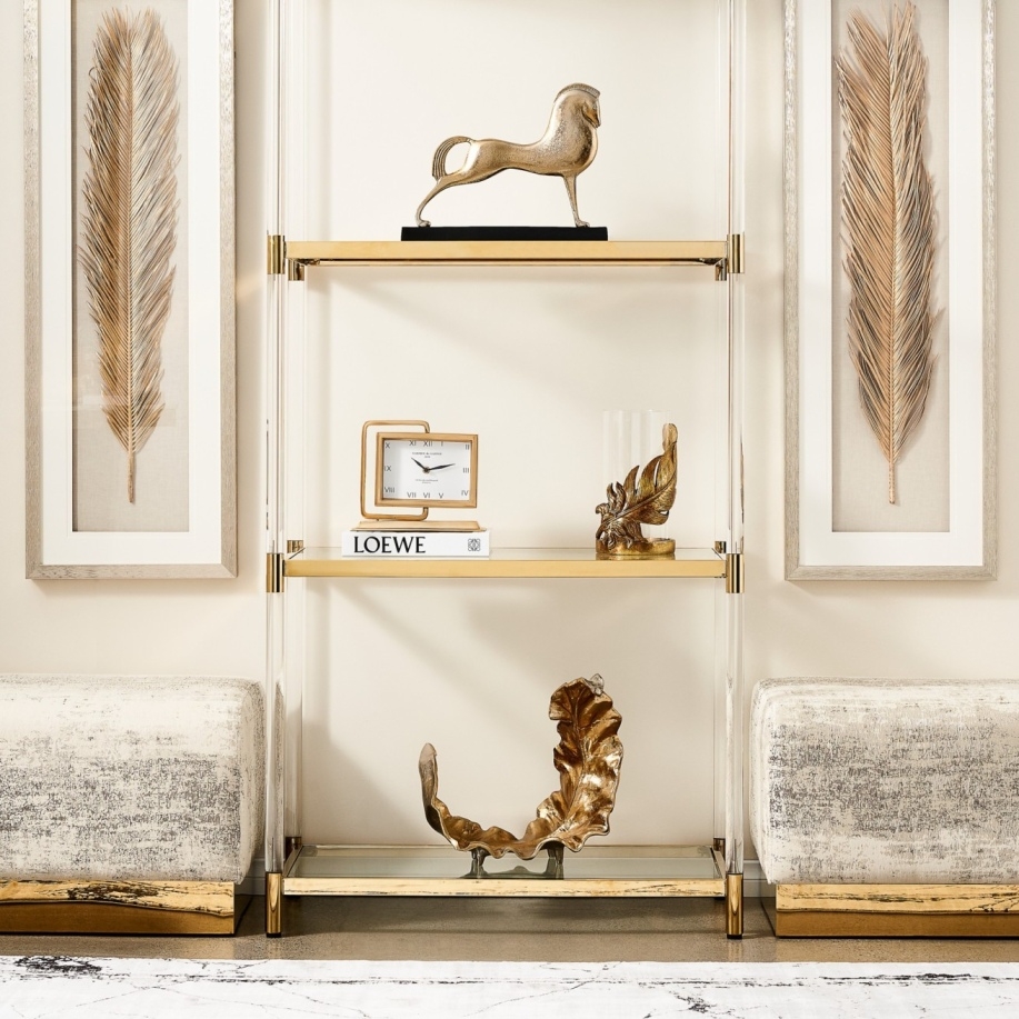 Featuring five glass shelves, the Auryn provides ample space for books, figurines, and keepsakes. The golden stainless steel borders add both stability and shine, making it a stylish and practical addition to your decor.