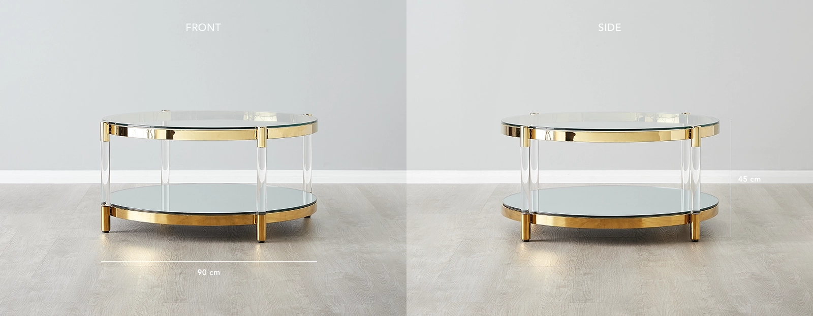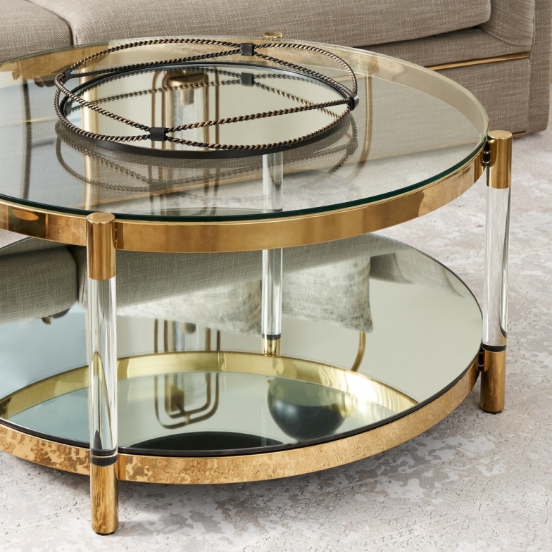 The Auryn Gold Stainless Steel Coffee Table combines glass, stainless steel, and acrylic for a sleek, modern design. Its clear glass tabletop is perfect for displaying keepsakes, while the mirrored lower section adds a unique touch.