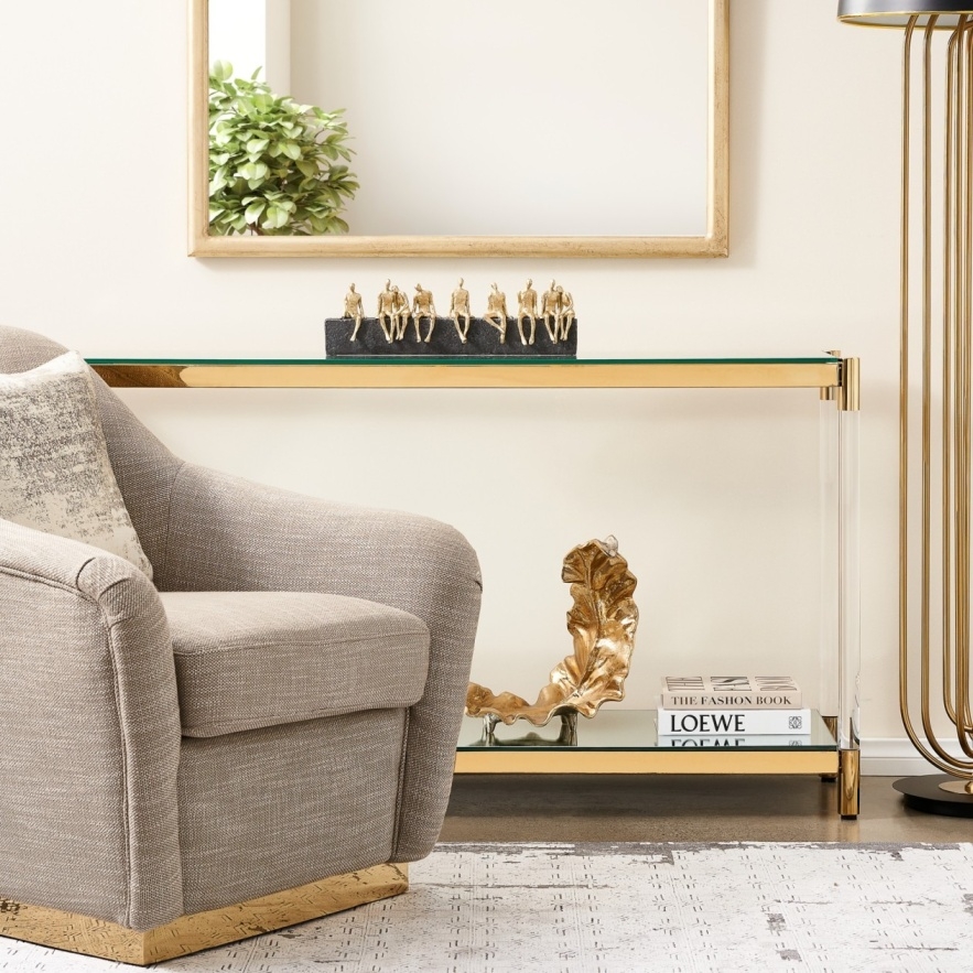 The tabletop features a beautiful cut of clear glass ready to be adorned with your decorations, keepsakes and more. The lower section is a gorgeous mirror, which holds a myriad of stylish possibilities. Providing support to the Auryn are these clear tubes that add to its striking aesthetics. The Auryn Gold Stainless Steel Console Table is best paired with one of our majestic sofas for a luxurious living room ensemble.