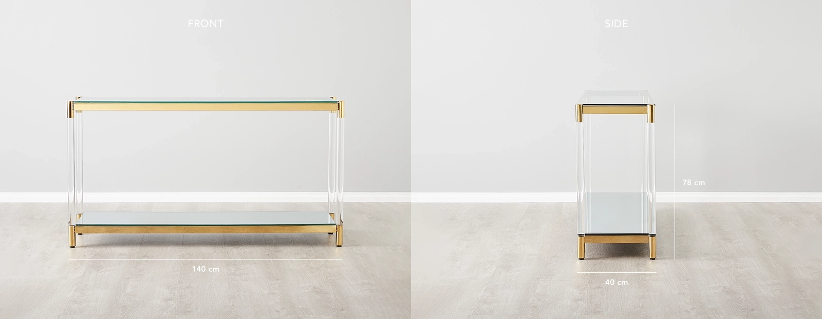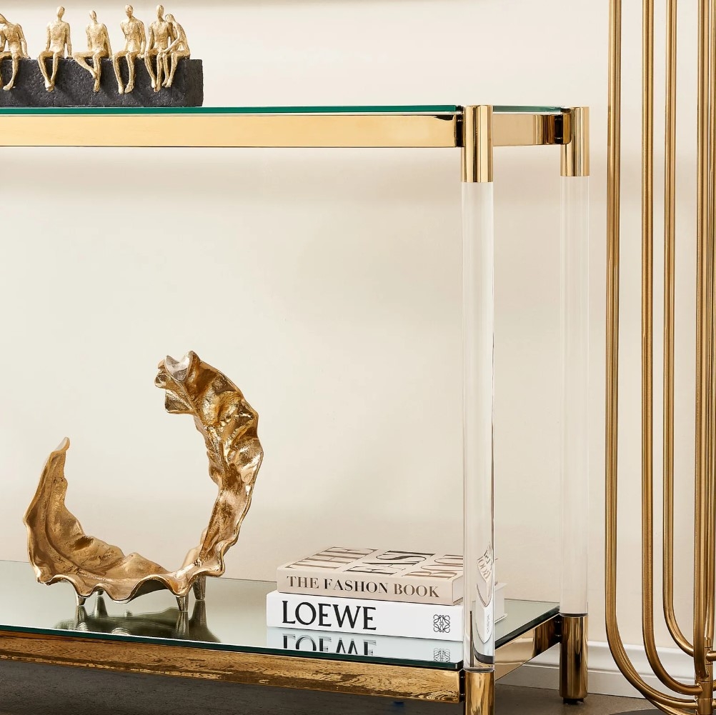 Glass and gold make for a luxurious combination, as evidenced by our Auryn Gold Stainless Steel Console Table. This majestic piece aims to add a lustrous glow to your home with its stylish design and striking colours. The Auryn is a Console Table made from a combination of Glass, Stainless steel and high-quality acrylic. It's composed of two different surfaces, each with its own unique features.