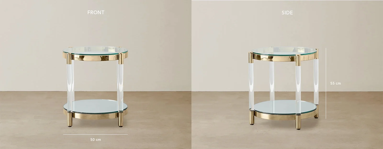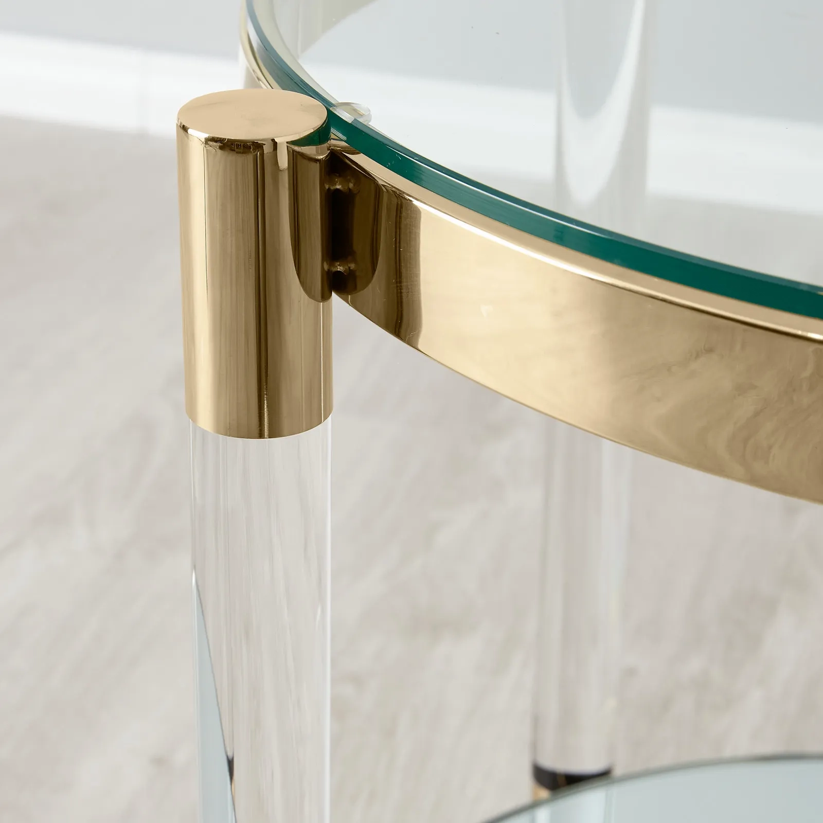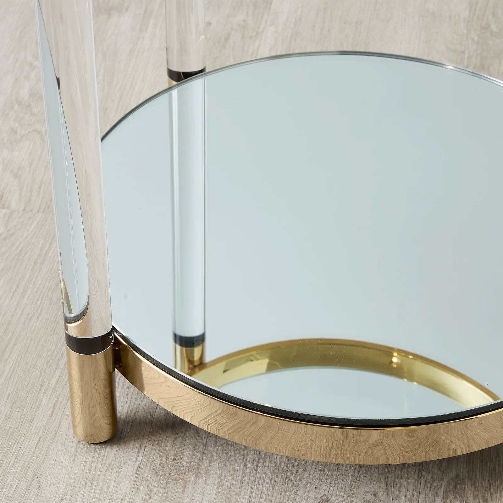 The Auryn Side Table combines glass, stainless steel, and acrylic in a sleek circular design. Its clear glass top is perfect for displaying essentials, while the mirrored lower section adds a stylish touch.