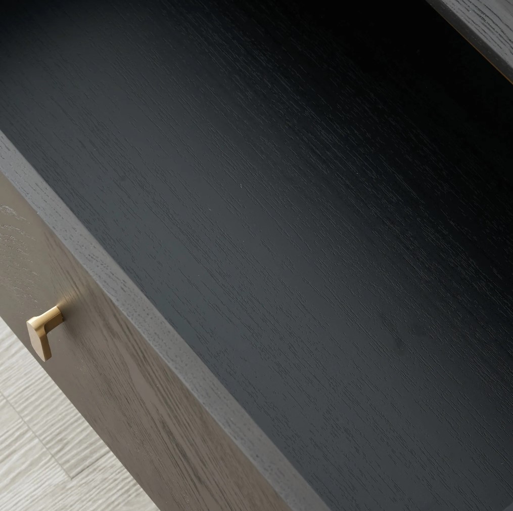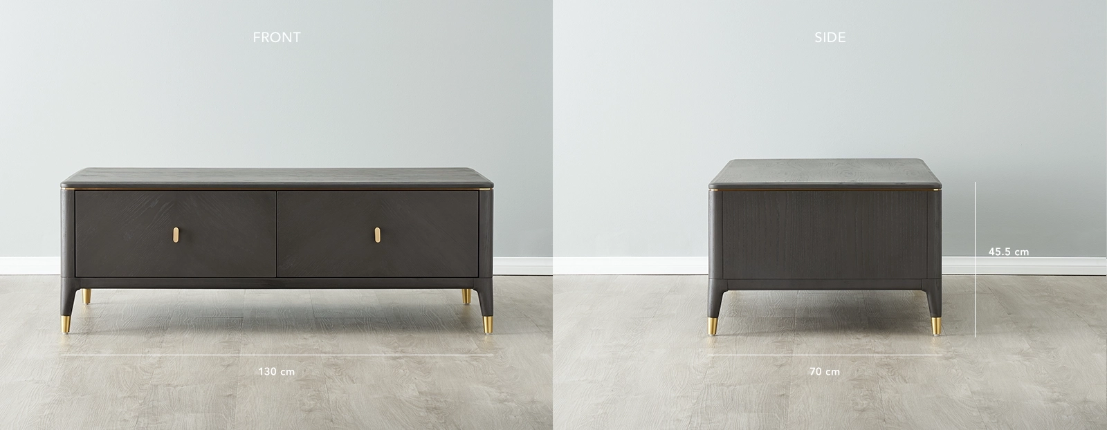 The Beckham Dark Grey Coffee Table includes two spacious drawers for storage and gold-accented handles, legs, and trim for a touch of glamour. Pair it with a stylish sofa and rug for an elegant and functional living room setup.