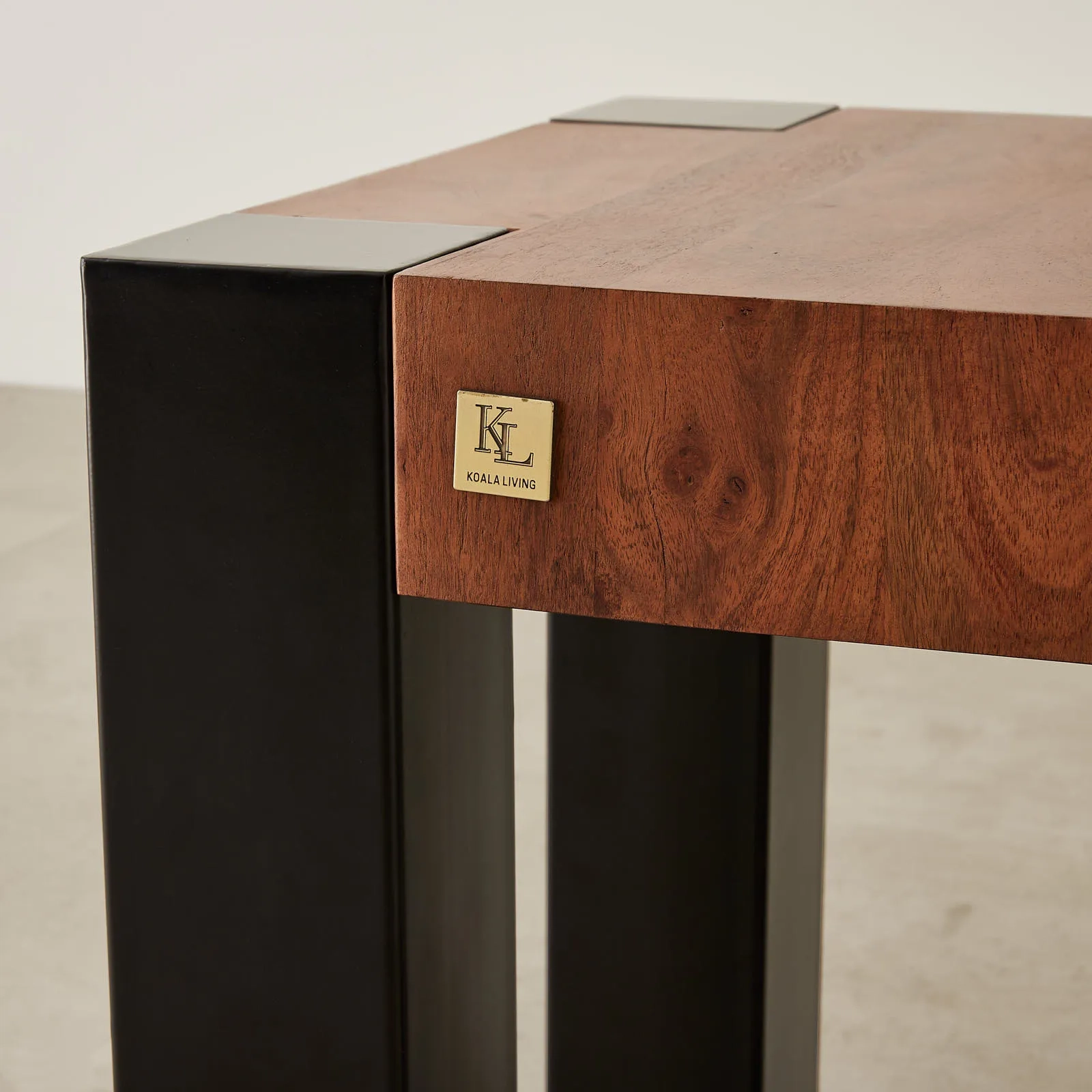 The Benedict Medium Brown Wooden Side Table features a design that seamlessly marries rustic charm with industrial flair. The tabletop's medium brown hue adds a touch of earthiness, while the matte black metal legs provide a stark, modern contrast, grounding the piece with a contemporary edge. This side table boasts a form that is both robust and stylish.