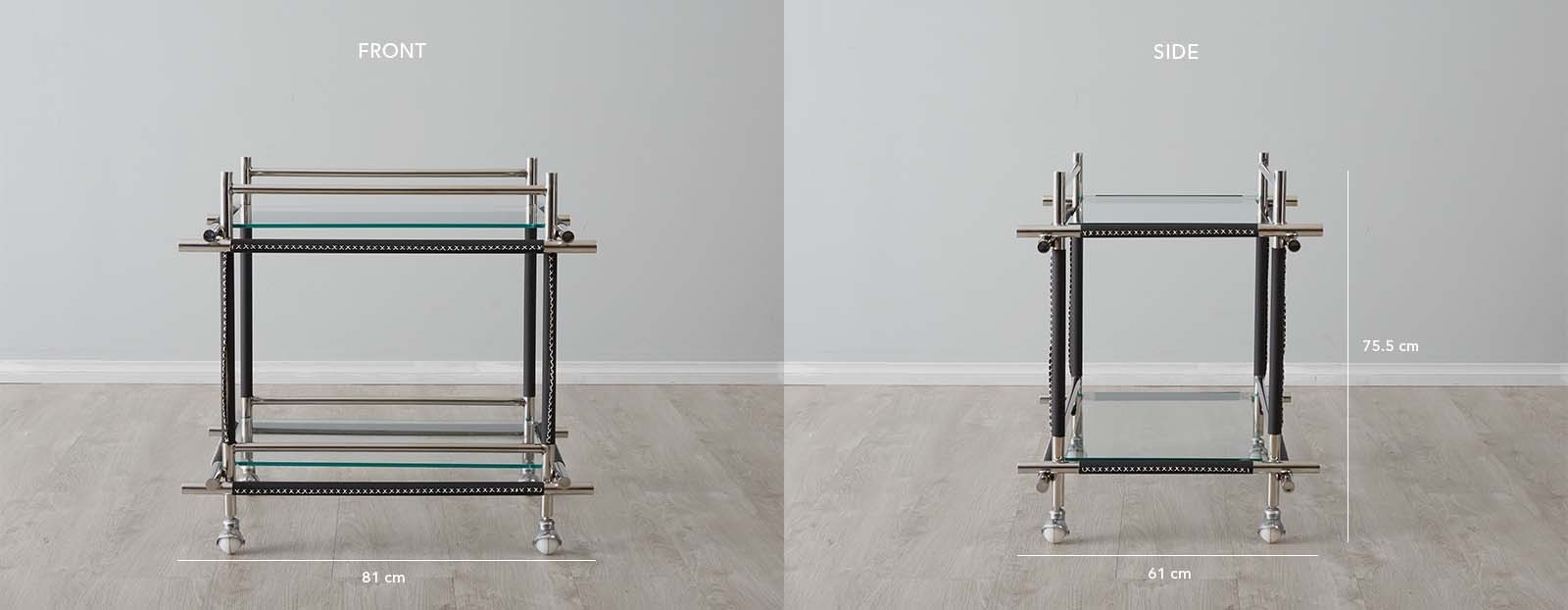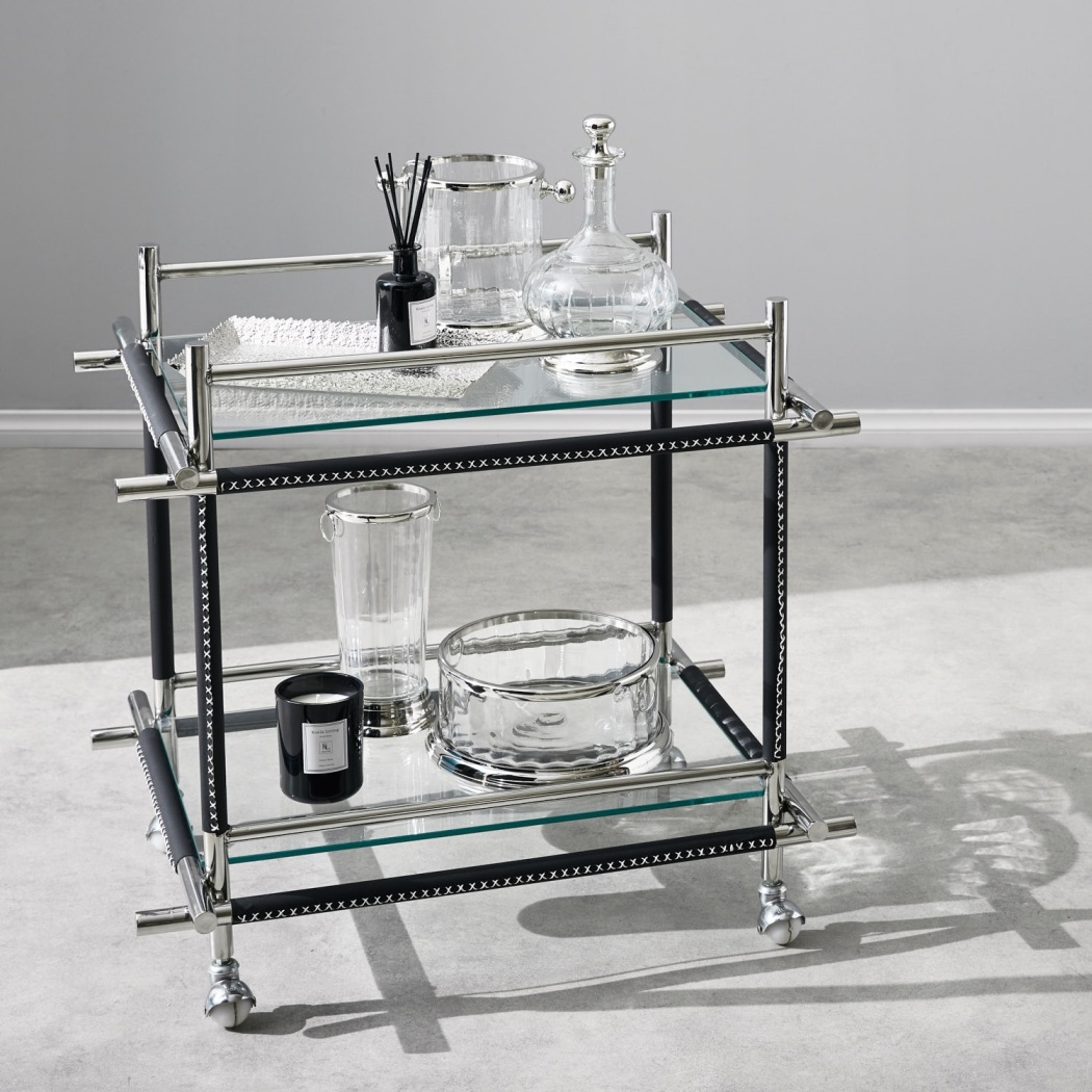 With its spacious trays, the Benson trolley offers ample room to showcase and store your favorite beverages, glassware, and bar accessories. Whether used in a dining area or home bar setting, this trolley becomes a functional and stylish addition that elevates your entertaining experience. Adding to its allure, the black and white leathered outline of the Benson trolley adds a distinct and luxurious look to the piece. This thoughtful detail enhances its aesthetic appeal and further sets it apart as a statement of refined taste.
