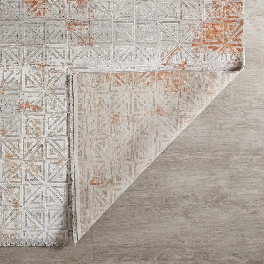 The Beth Floor Rug transcends the ordinary with its extraordinary fusion of design and color. It is as if an ornate glyph, a relic from a bygone era, is being gently eroded by the sands of time right on your floor. An intricate motif of squares encircles the rug, a testament to the timelessness of geometric beauty. This pattern blends subtle oranges with muted greys, bestowing upon the rug a weathered, antiqued effect that is rich in character.