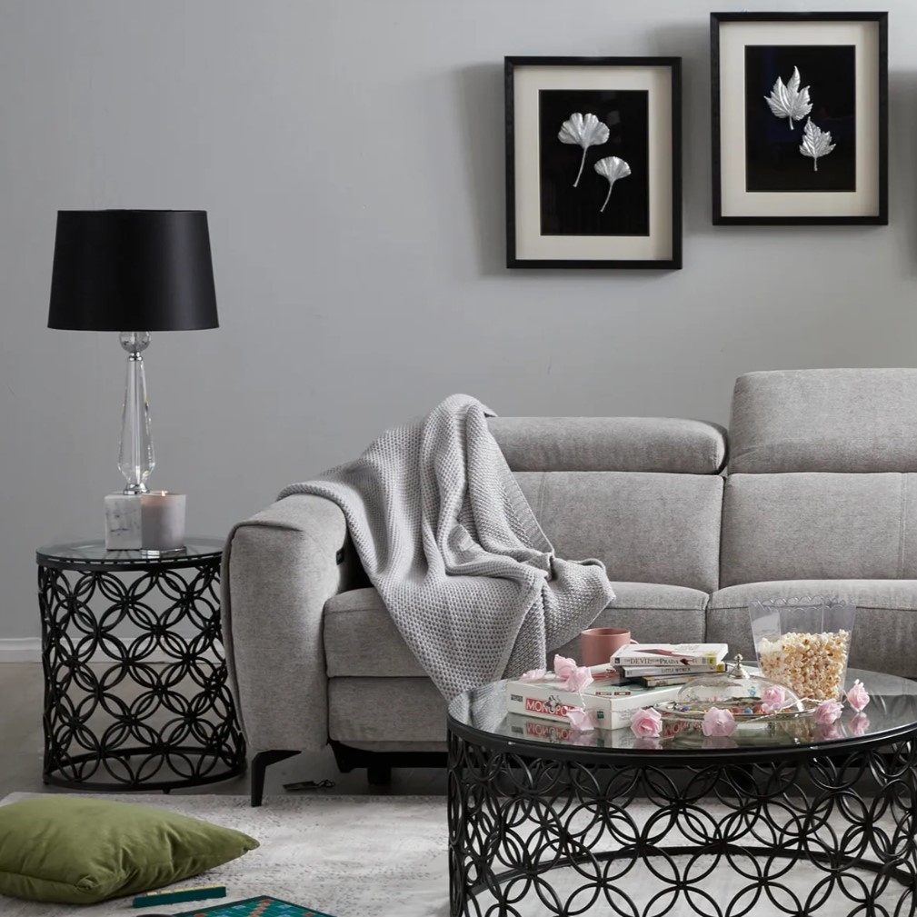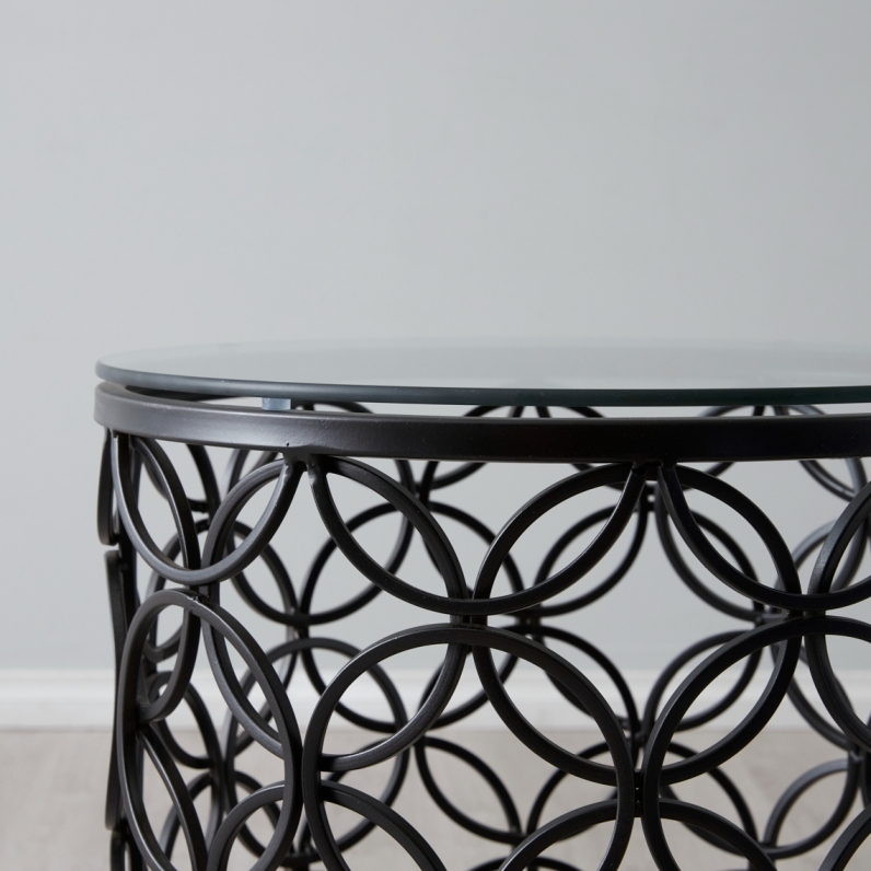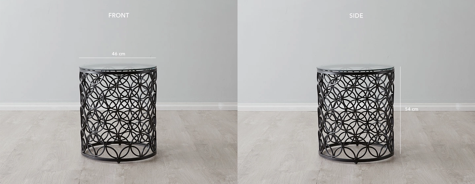The Bianca Side Table is elegantly fashioned from iron frame coated in matte black colour and arranged in a mesmerizing interlinking design. Its generous round surface in tempered glass offers space for your essentials. The Bianca can also keep your space clutter free by using its underside as a space for books and magazines. Pair the Bianca with an ensemble of Occasional Chairs along with one of our Sofas to create a luxurious room of comfort.
