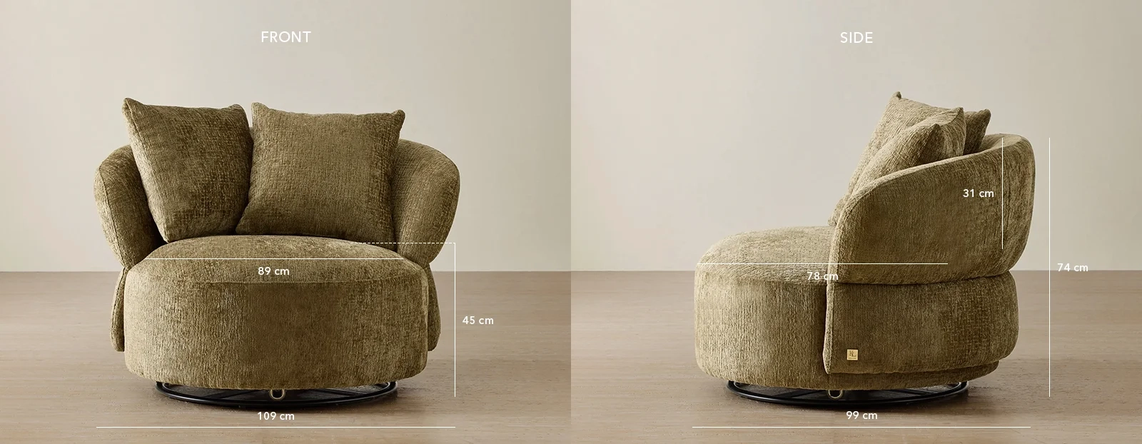 Shaped with a generous circular form, this chair offers an enveloping seat supported by plush cushions for long-lasting comfort. A smooth swivel base adds gentle movement, blending ease and function.