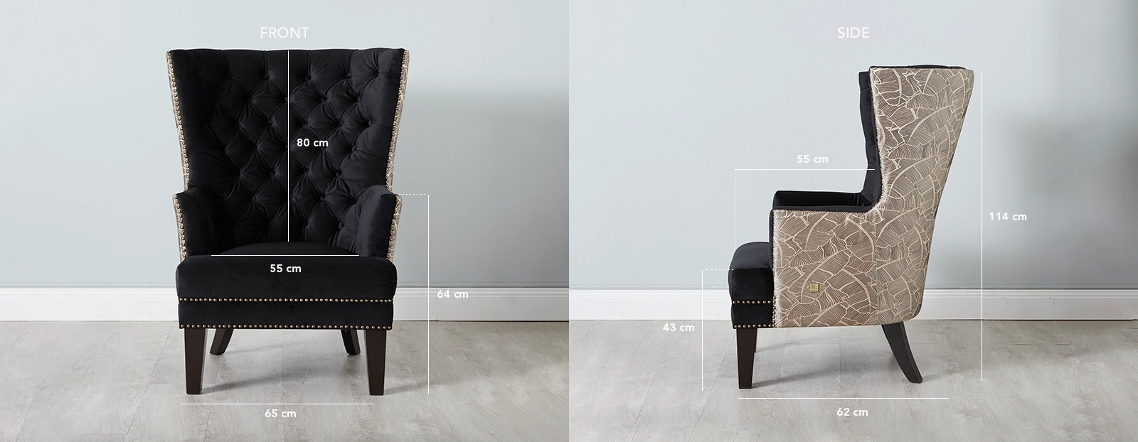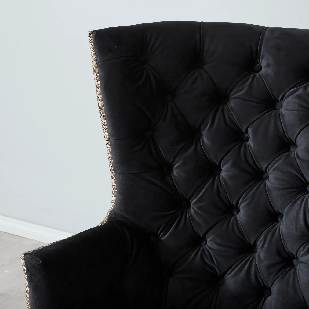 The Boudicca Chair merges contemporary style with classic wingback design, infused with Art Deco flair for a timeless yet bold appeal. Its black velvet upholstery exudes luxury and sophistication, while the distinctive geometric lines and elegant detailing capture the essence of Art Deco.