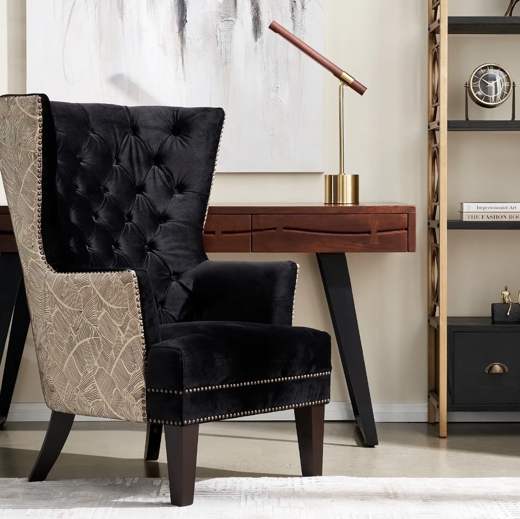 The Boudicca Chair's diamond tufting and leaf detailing add comfort and charm, while wooden legs and elegant studs enhance its appeal. It works well with a desk or as a living room centerpiece.