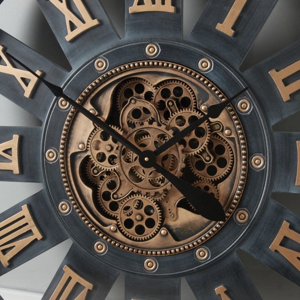 Step into a realm of elegance and mechanical wonder with the Brandon Round Wall Clock. Encompassed in its large circular design is a statement of grandeur that elevates any room's ambiance. At the heart of this timepiece, an intricate ensemble of gears takes center stage, beautifully contrasting with the dark iron hands that sweep over them.