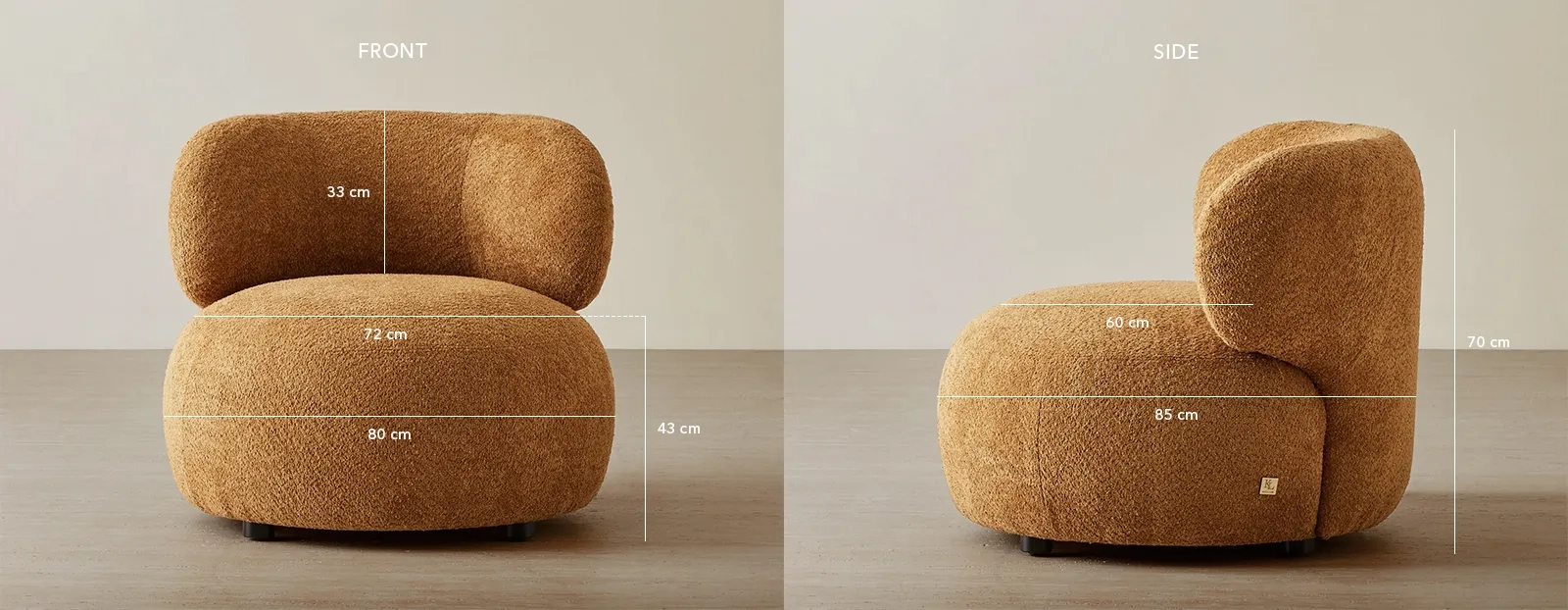 Grounded by a simple base, it blends form and function with quiet confidence. The generous seat and gently rounded backrest offer a grounded, cocoon-like experience, ideal for slow moments and quiet pauses.