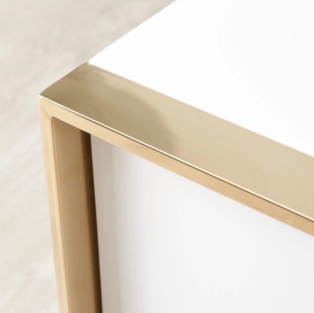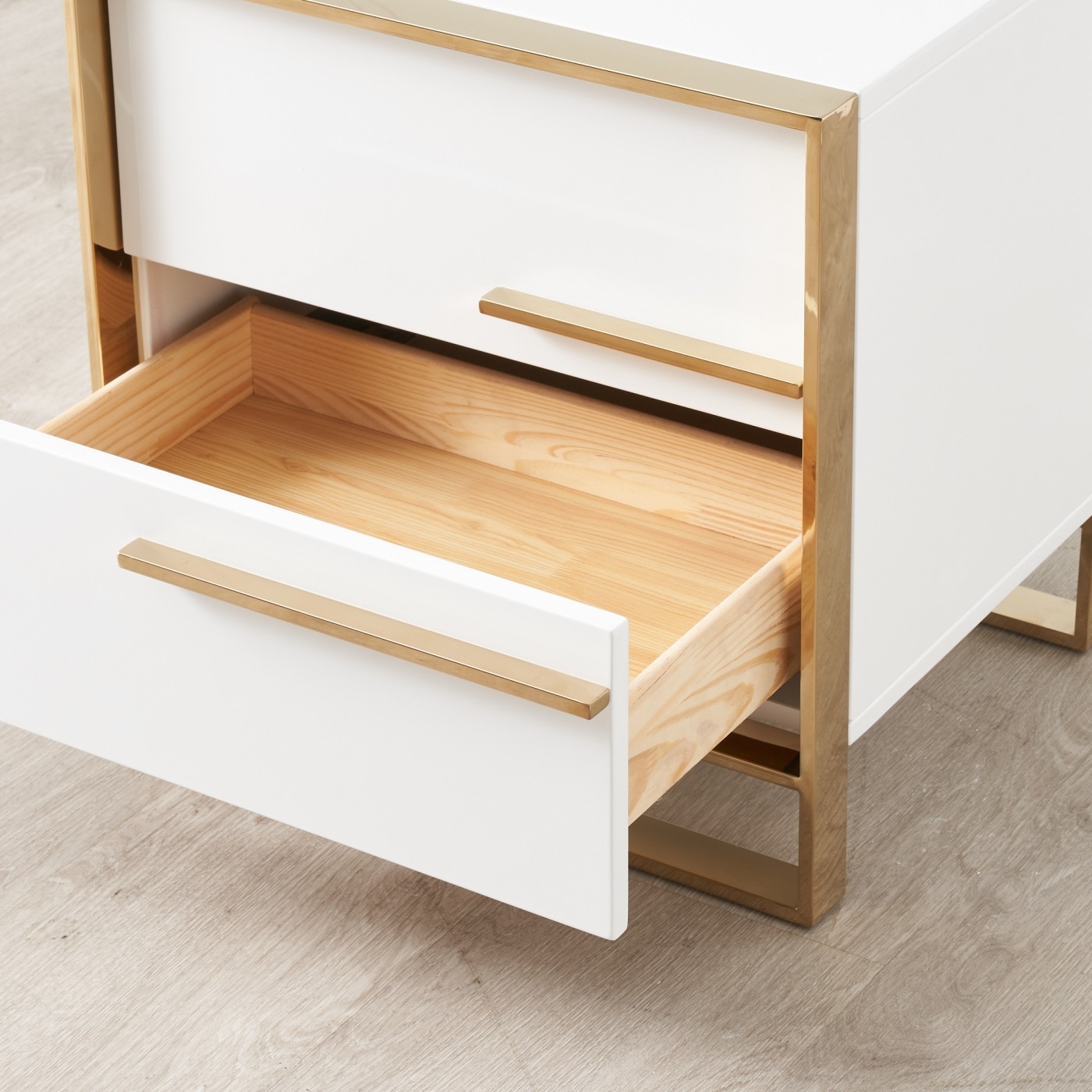 Elevate your bedroom with the timeless allure of the Broden White Bedside Table—a perfect blend of modernity, elegance, and minimalist design. Immerse yourself in its captivating beauty and undeniable colours of luxury. The Broden Bedside Table showcases a sleek and minimalist design that exudes modernity and sophistication. Its gold-coloured stainless steel frame gracefully outlines the two cabinets, adding a touch of glamour to the piece. The minimalist handles on its borders enhance the overall aesthetic, combining functionality with elegant simplicity.