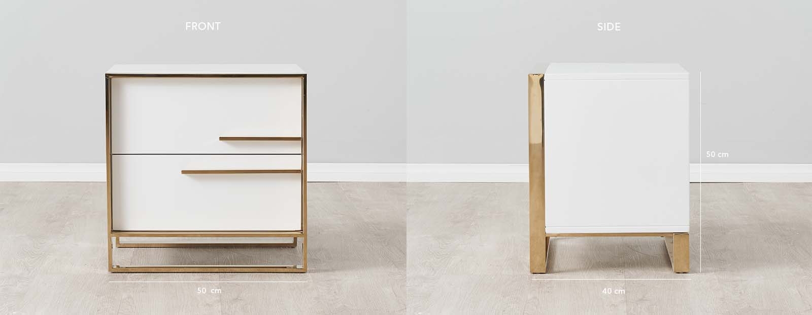 Open up the drawers to reveal masterfully crafted storage spaces, thoughtfully designed to meet your curating needs. With the right amount of space, the drawers provide ample room to keep your essentials organized and easily accessible. With its minimalist design, pristine white finish, and accents of gold, the Broden Bedside Table effortlessly adds a luxurious touch to any bedroom. It becomes a focal point that exudes modern elegance, enhancing the ambiance of your sleeping sanctuary.